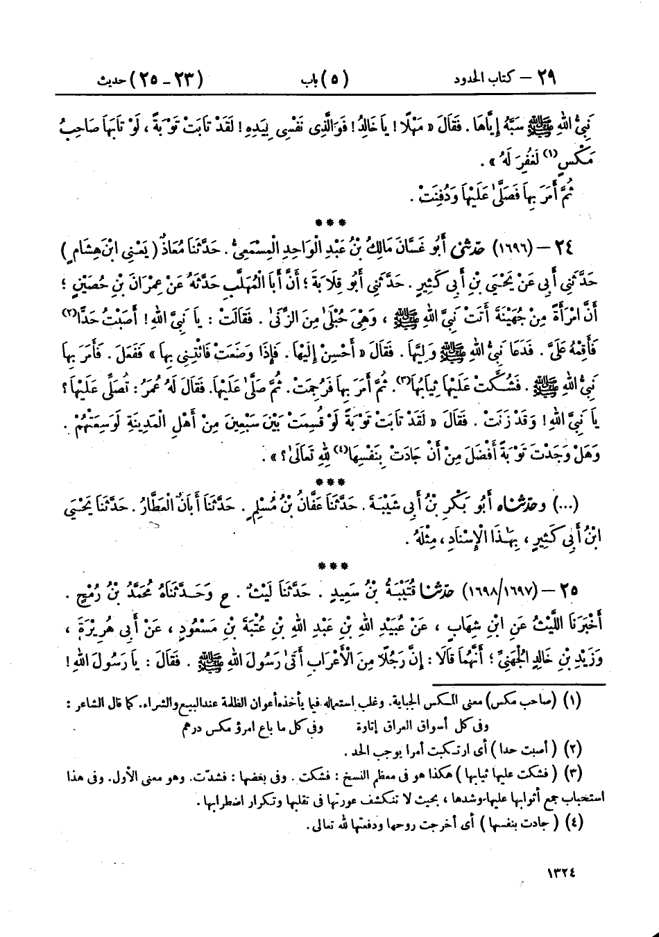 24 - (1696) حَدَّثَنِي أَبُو غَسَّانَ مَالِكُ بْنُ عَبْدِ الْوَاحِدِ الْمِسْمَعِيُّ، حَدَّثَنَا مُعَاذٌ يَعْنِي ابْنَ هِشَامٍ، حَدَّثَنِي أَبِي، عَنْ يَحْيَى بْنِ أَبِي كَثِيرٍ، حَدَّثَنِي أَبُو قِلَابَةَ، أَنَّ أَبَا الْمُهَلَّبِ، حَدَّثَهُ، عَنْ عِمْرَانَ بْنِ حُصَيْنٍ، أَنَّ امْرَأَةً مِنْ جُهَيْنَةَ أَتَتْ نَبِيَّ اللهِ صَلَّى اللهُ عَلَيْهِ وَسَلَّمَ وَهِيَ حُبْلَى مِنَ الزِّنَى، فَقَالَتْ: يَا نَبِيَّ اللهِ، أَصَبْتُ حَدًّا، فَأَقِمْهُ عَلَيَّ، فَدَعَا نَبِيُّ اللهِ صَلَّى اللهُ عَلَيْهِ وَسَلَّمَ وَلِيَّهَا، فَقَالَ: «أَحْسِنْ إِلَيْهَا، فَإِذَا وَضَعَتْ فَأْتِنِي بِهَا»، فَفَعَلَ، فَأَمَرَ بِهَا نَبِيُّ اللهِ صَلَّى اللهُ عَلَيْهِ وَسَلَّمَ، فَشُكَّتْ عَلَيْهَا ثِيَابُهَا، ثُمَّ أَمَرَ بِهَا فَرُجِمَتْ، ثُمَّ صَلَّى عَلَيْهَا، فَقَالَ لَهُ عُمَرُ: تُصَلِّي عَلَيْهَا يَا نَبِيَّ اللهِ وَقَدْ زَنَتْ؟ فَقَالَ: «§لَقَدْ تَابَتْ تَوْبَةً لَوْ قُسِمَتْ بَيْنَ سَبْعِينَ مِنْ أَهْلِ الْمَدِينَةِ لَوَسِعَتْهُمْ، وَهَلْ وَجَدْتَ تَوْبَةً أَفْضَلَ مِنْ أَنْ جَادَتْ بِنَفْسِهَا لِلَّهِ تَعَالَى؟»،