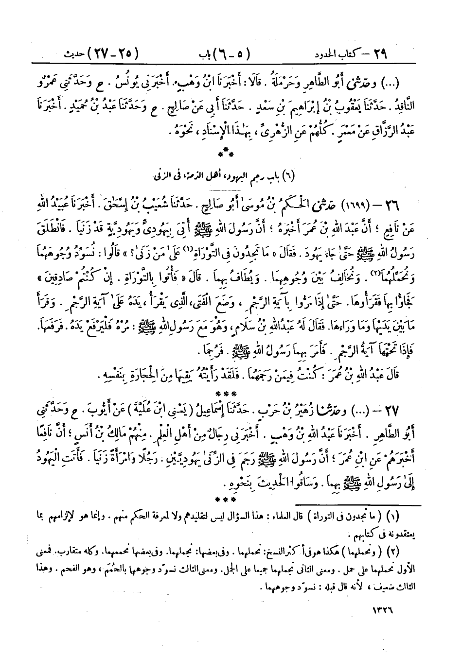 26 - (1699) حَدَّثَنِي الْحَكَمُ بْنُ مُوسَى أَبُو صَالِحٍ، حَدَّثَنَا شُعَيْبُ بْنُ إِسْحَاقَ، أَخْبَرَنَا عُبَيْدُ اللهِ، عَنْ نَافِعٍ، أَنَّ عَبْدَ اللهِ بْنَ عُمَرَ، أَخْبَرَهُ، أَنَّ رَسُولَ اللهِ صَلَّى اللهُ عَلَيْهِ وَسَلَّمَ أُتِيَ بِيَهُودِيٍّ وَيَهُودِيَّةٍ قَدْ زَنَيَا، فَانْطَلَقَ رَسُولُ اللهِ صَلَّى اللهُ عَلَيْهِ وَسَلَّمَ حَتَّى جَاءَ يَهُودَ، فَقَالَ: «§مَا تَجِدُونَ فِي التَّوْرَاةِ عَلَى مَنْ زَنَى؟» قَالُوا: نُسَوِّدُ وُجُوهَهُمَا، وَنُحَمِّلُهُمَا، وَنُخَالِفُ بَيْنَ وُجُوهِهِمَا، وَيُطَافُ بِهِمَا، قَالَ: «فَأْتُوا بِالتَّوْرَاةِ إِنْ كُنْتُمْ صَادِقِينَ»، فَجَاءُوا بِهَا فَقَرَءُوهَا حَتَّى إِذَا مَرُّوا بِآيَةِ الرَّجْمِ وَضَعَ الْفَتَى الَّذِي يَقْرَأُ يَدَهُ عَلَى آيَةِ الرَّجْمِ، وَقَرَأَ مَا بَيْنَ يَدَيْهَا، وَمَا وَرَاءَهَا، فَقَالَ لَهُ عَبْدُ اللهِ بْنُ سَلَامٍ: وَهُوَ مَعَ رَسُولِ اللهِ صَلَّى اللهُ عَلَيْهِ وَسَلَّمَ مُرْهُ فَلْيَرْفَعْ يَدَهُ، فَرَفَعَهَا فَإِذَا تَحْتَهَا آيَةُ الرَّجْمِ، فَأَمَرَ بِهِمَا رَسُولُ اللهِ صَلَّى اللهُ عَلَيْهِ وَسَلَّمَ، فَرُجِمَا، قَالَ عَبْدُ اللهِ بْنُ عُمَرَ: كُنْتُ فِيمَنْ رَجَمَهُمَا، فَلَقَدْ رَأَيْتُهُ يَقِيهَا مِنَ الْحِجَارَةِ بِنَفْسِهِ،