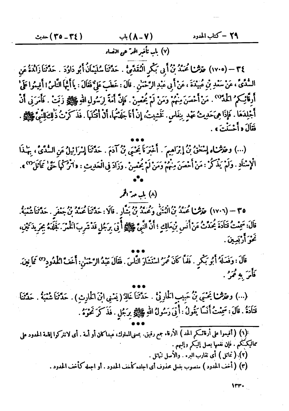 35 - (1706) حَدَّثَنَا مُحَمَّدُ بْنُ الْمُثَنَّى، وَمُحَمَّدُ بْنُ بَشَّارٍ، قَالَا: حَدَّثَنَا مُحَمَّدُ بْنُ جَعْفَرٍ، حَدَّثَنَا شُعْبَةُ، قَالَ: سَمِعْتُ قَتَادَةَ، يُحَدِّثُ عَنْ أَنَسِ بْنِ مَالِكٍ، «أَنَّ النَّبِيَّ صَلَّى اللهُ عَلَيْهِ وَسَلَّمَ §أُتِيَ بِرَجُلٍ قَدْ شَرِبَ الْخَمْرَ، فَجَلَدَهُ بِجَرِيدَتَيْنِ نَحْوَ أَرْبَعِينَ»، قَالَ: وَفَعَلَهُ أَبُو بَكْرٍ، فَلَمَّا كَانَ عُمَرُ اسْتَشَارَ النَّاسَ، فَقَالَ عَبْدُ الرَّحْمَنِ: أَخَفَّ الْحُدُودِ ثَمَانِينَ، «فَأَمَرَ بِهِ عُمَرُ»،