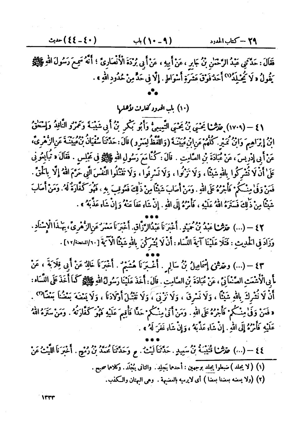 41 - (1709) حَدَّثَنَا يَحْيَى بْنُ يَحْيَى التَّمِيمِيُّ، وَأَبُو بَكْرِ بْنُ أَبِي شَيْبَةَ، وَعَمْرٌو النَّاقِدُ، وَإِسْحَاقُ بْنُ إِبْرَاهِيمَ، وَابْنُ نُمَيْرٍ، كُلُّهُمْ عَنِ ابْنِ عُيَيْنَةَ، وَاللَّفْظُ لِعَمْرٍو، قَالَ: حَدَّثَنَا سُفْيَانُ بْنُ عُيَيْنَةَ، عَنِ الزُّهْرِيِّ، عَنْ أَبِي إِدْرِيسَ، عَنْ عُبَادَةَ بْنِ الصَّامِتِ، قَالَ: كُنَّا مَعَ رَسُولِ اللهِ صَلَّى اللهُ عَلَيْهِ وَسَلَّمَ فِي مَجْلِسٍ، فَقَالَ: «§تُبَايِعُونِي عَلَى أَنْ لَا تُشْرِكُوا بِاللهِ شَيْئًا، وَلَا تَزْنُوا، وَلَا تَسْرِقُوا، وَلَا تَقْتُلُوا النَّفْسَ الَّتِي حَرَّمَ اللهُ إِلَّا بِالْحَقِّ، فَمَنْ وَفَى مِنْكُمْ فَأَجْرُهُ عَلَى اللهِ، وَمَنْ أَصَابَ شَيْئًا مِنْ ذَلِكَ فَعُوقِبَ بِهِ فَهُوَ كَفَّارَةٌ لَهُ، وَمَنْ أَصَابَ شَيْئًا مِنْ ذَلِكَ فَسَتَرَهُ اللهُ عَلَيْهِ، فَأَمْرُهُ إِلَى اللهِ، إِنْ شَاءَ عَفَا عَنْهُ، وَإِنْ شَاءَ عَذَّبَهُ»،