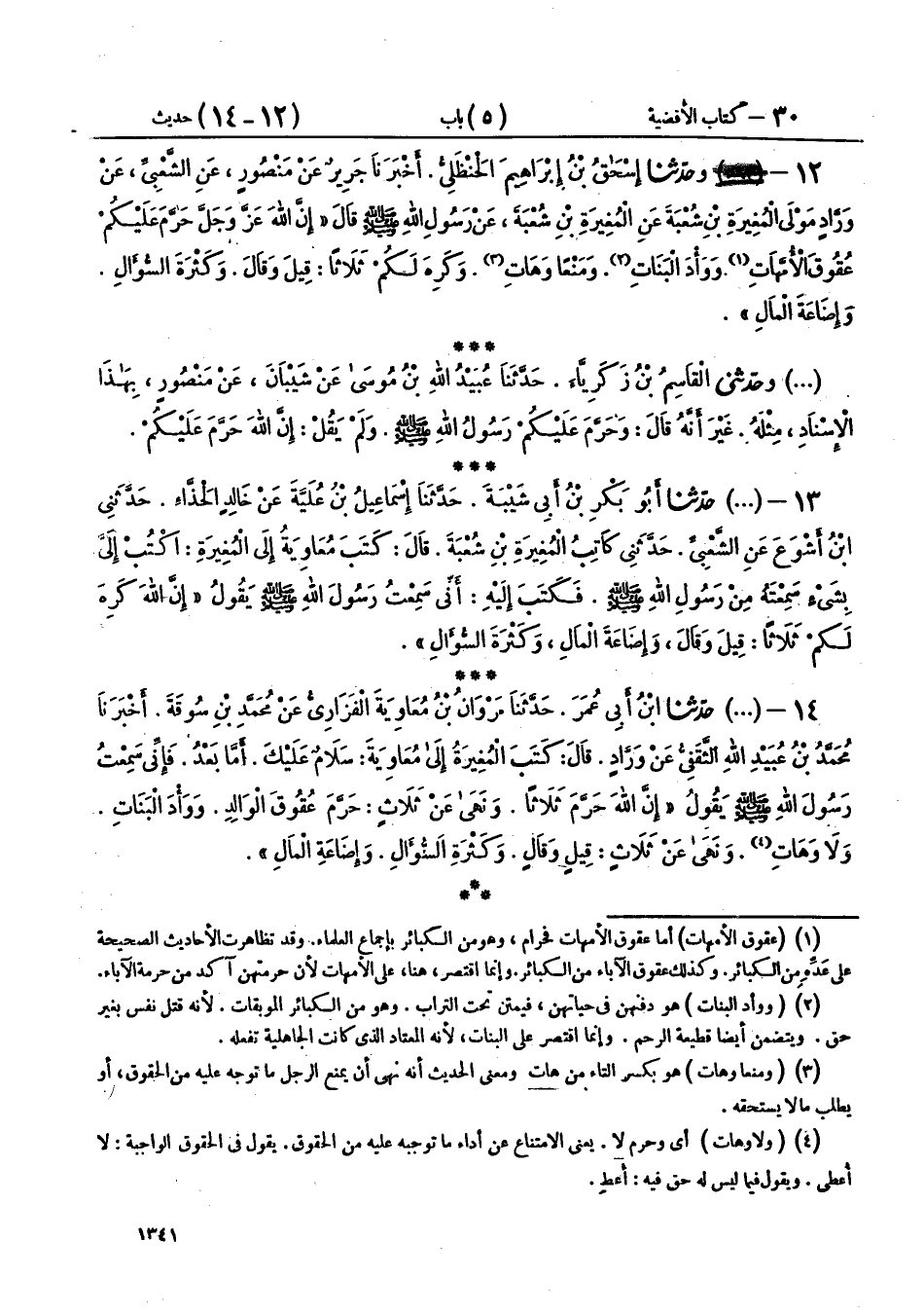 12 - (593) وحَدَّثَنَا إِسْحَاقُ بْنُ إِبْرَاهِيمَ الْحَنْظَلِيُّ، أَخْبَرَنَا جَرِيرٌ، عَنْ مَنْصُورٍ، عَنِ الشَّعْبِيِّ، عَنْ وَرَّادٍ، مَوْلَى الْمُغِيرَةِ بْنِ شُعْبَةَ، عَنِ الْمُغِيرَةِ بْنِ شُعْبَةَ، عَنْ رَسُولِ اللهِ صَلَّى اللهُ عَلَيْهِ وَسَلَّمَ قَالَ: " إِنَّ §اللهَ عَزَّ وَجَلَّ حَرَّمَ عَلَيْكُمْ: عُقُوقَ الْأُمَّهَاتِ، وَوَأْدَ الْبَنَاتِ، وَمَنْعًا وَهَاتِ، وَكَرِهَ لَكُمْ ثَلَاثًا: قِيلَ وَقَالَ، وَكَثْرَةَ السُّؤَالِ، وَإِضَاعَةَ الْمَالِ "،