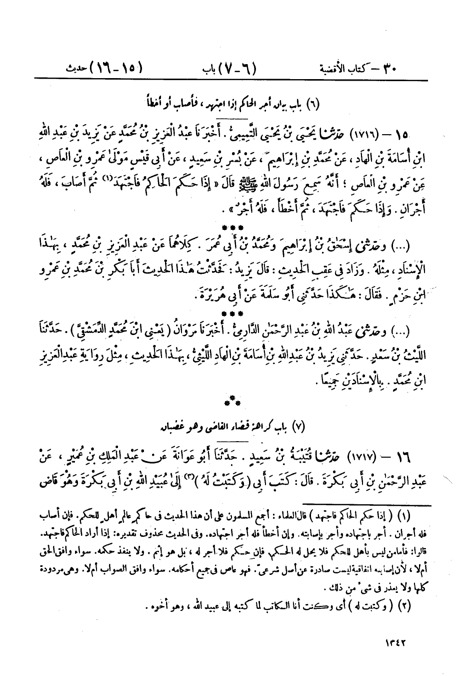15 - (1716) حَدَّثَنَا يَحْيَى بْنُ يَحْيَى التَّمِيمِيُّ، أَخْبَرَنَا عَبْدُ الْعَزِيزِ بْنُ مُحَمَّدٍ، عَنْ يَزِيدَ بْنِ عَبْدِ اللهِ بْنِ أُسَامَةَ بْنِ الْهَادِ، عَنْ مُحَمَّدِ بْنِ إِبْرَاهِيمَ، عَنْ بُسْرِ بْنِ سَعِيدٍ، عَنْ أَبِي قَيْسٍ، مَوْلَى عَمْرِو بْنِ الْعَاصِ، عَنْ عَمْرِو بْنِ الْعَاصِ، أَنَّهُ سَمِعَ رَسُولَ اللهِ صَلَّى اللهُ عَلَيْهِ وَسَلَّمَ قَالَ: «§إِذَا حَكَمَ الْحَاكِمُ فَاجْتَهَدَ ثُمَّ أَصَابَ، فَلَهُ أَجْرَانِ، وَإِذَا حَكَمَ فَاجْتَهَدَ ثُمَّ أَخْطَأَ، فَلَهُ أَجْرٌ»،