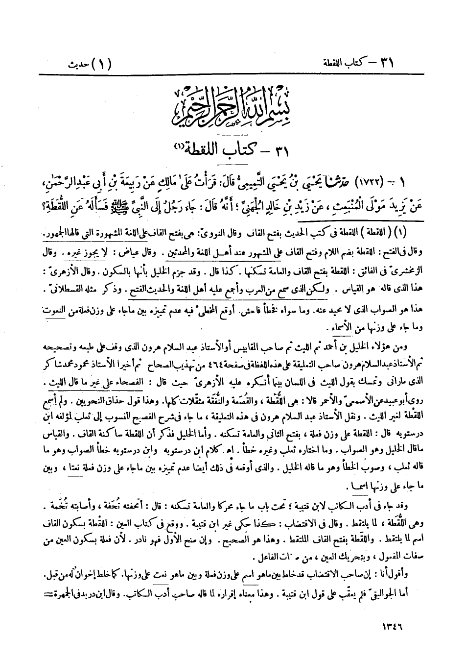 1 - (1722) حَدَّثَنَا يَحْيَى بْنُ يَحْيَى التَّمِيمِيُّ، قَالَ: قَرَأْتُ عَلَى مَالِكٍ، عَنْ رَبِيعَةَ بْنِ أَبِي عَبْدِ الرَّحْمَنِ، عَنْ يَزِيدَ، مَوْلَى الْمُنْبَعِثِ، عَنْ زَيْدِ بْنِ خَالِدٍ الْجُهَنِيِّ، أَنَّهُ قَالَ: جَاءَ رَجُلٌ إِلَى النَّبِيِّ صَلَّى اللهُ عَلَيْهِ وَسَلَّمَ، فَسَأَلَهُ عَنِ اللُّقَطَةِ -[1347]-، فَقَالَ: «§اعْرِفْ عِفَاصَهَا وَوِكَاءَهَا، ثُمَّ عَرِّفْهَا سَنَةً، فَإِنْ جَاءَ صَاحِبُهَا، وَإِلَّا فَشَأْنَكَ بِهَا»، قَالَ فَضَالَّةُ الْغَنَمِ؟ قَالَ: «لَكَ، أَوْ لِأَخِيكَ، أَوْ لِلذِّئْبِ»، قَالَ: فَضَالَّةُ الْإِبِلِ؟ قَالَ: «مَا لَكَ وَلَهَا، مَعَهَا سِقَاؤُهَا، وَحِذَاؤُهَا تَرِدُ الْمَاءَ، وَتَأْكُلُ الشَّجَرَ حَتَّى يَلْقَاهَا رَبُّهَا»، قَالَ يَحْيَى: أَحْسِبُ قَرَأْتُ عِفَاصَهَا