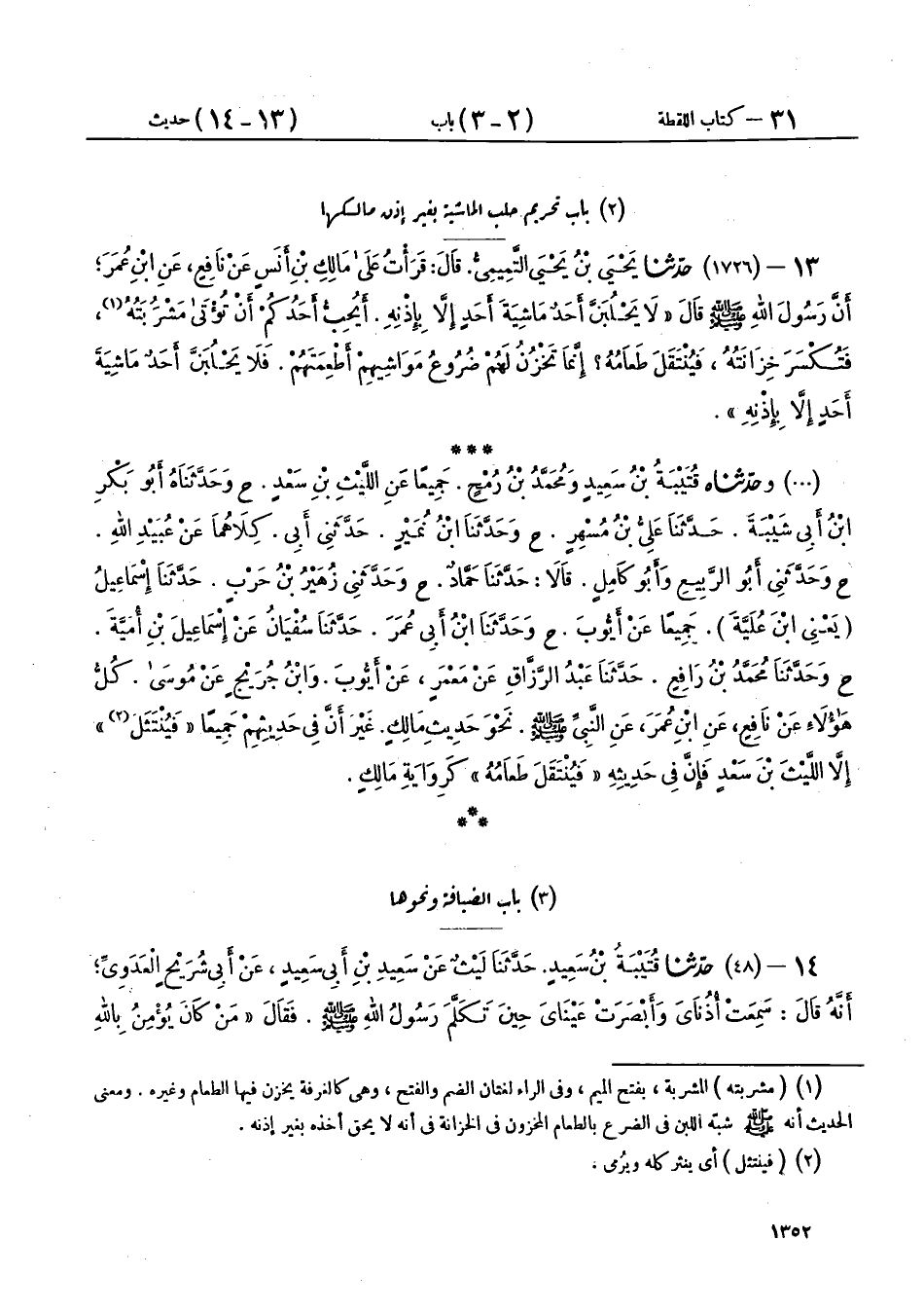 13 - (1726) حَدَّثَنَا يَحْيَى بْنُ يَحْيَى التَّمِيمِيُّ، قَالَ: قَرَأْتُ عَلَى مَالِكِ بْنِ أَنَسٍ، عَنْ نَافِعٍ، عَنِ ابْنِ عُمَرَ، أَنَّ رَسُولَ اللهِ صَلَّى اللهُ عَلَيْهِ وَسَلَّمَ، قَالَ: «§لَا يَحْلُبَنَّ أَحَدٌ مَاشِيَةَ أَحَدٍ إِلَّا بِإِذْنِهِ، أَيُحِبُّ أَحَدُكُمْ أَنْ تُؤْتَى مَشْرُبَتُهُ، فَتُكْسَرَ خِزَانَتُهُ، فَيُنْتَقَلَ طَعَامُهُ؟ إِنَّمَا تَخْزُنُ لَهُمْ ضُرُوعُ مَوَاشِيهِمْ أَطْعِمَتَهُمْ، فَلَا يَحْلُبَنَّ أَحَدٌ مَاشِيَةَ أَحَدٍ إِلَّا بِإِذْنِهِ»،