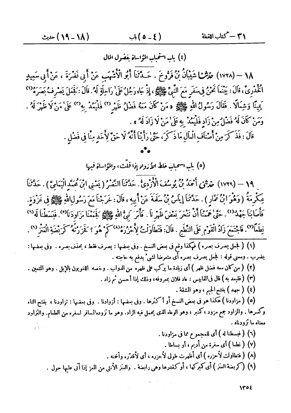 18 - (1728) حَدَّثَنَا شَيْبَانُ بْنُ فَرُّوخَ، حَدَّثَنَا أَبُو الْأَشْهَبِ، عَنْ أَبِي نَضْرَةَ، عَنْ أَبِي سَعِيدٍ الْخُدْرِيِّ، قَالَ: بَيْنَمَا نَحْنُ فِي سَفَرٍ مَعَ النَّبِيِّ صَلَّى اللهُ عَلَيْهِ وَسَلَّمَ إِذْ جَاءَ رَجُلٌ عَلَى رَاحِلَةٍ لَهُ، قَالَ: فَجَعَلَ يَصْرِفُ بَصَرَهُ يَمِينًا وَشِمَالًا، فَقَالَ رَسُولُ اللهِ صَلَّى اللهُ عَلَيْهِ وَسَلَّمَ: «§مَنْ كَانَ مَعَهُ فَضْلُ ظَهْرٍ، فَلْيَعُدْ بِهِ عَلَى مَنْ لَا ظَهْرَ لَهُ، وَمَنْ كَانَ لَهُ فَضْلٌ مِنْ زَادٍ، فَلْيَعُدْ بِهِ عَلَى مَنْ لَا زَادَ لَهُ»، قَالَ: فَذَكَرَ مِنْ أَصْنَافِ الْمَالِ مَا ذَكَرَ حَتَّى رَأَيْنَا أَنَّهُ لَا حَقَّ لِأَحَدٍ مِنَّا فِي فَضْلٍ