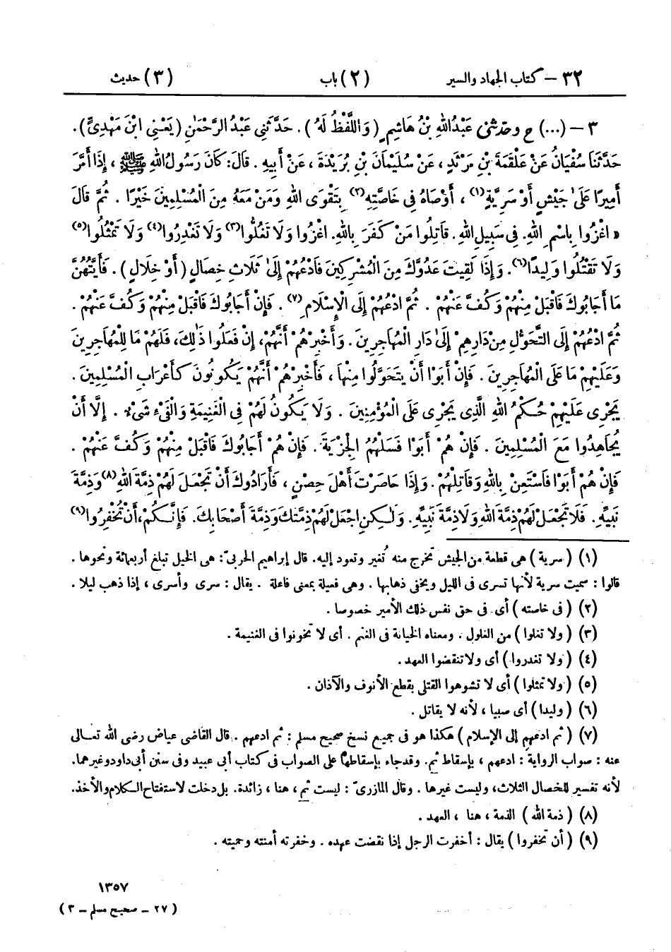 3 - (1731) وحَدَّثَنِي عَبْدُ اللهِ بْنُ هَاشِمٍ، وَاللَّفْظُ لَهُ، حَدَّثَنِي عَبْدُ الرَّحْمَنِ يَعْنِي ابْنَ مَهْدِيٍّ، حَدَّثَنَا سُفْيَانُ، عَنْ عَلْقَمَةَ بْنِ مَرْثَدٍ، عَنْ سُلَيْمَانَ بْنِ بُرَيْدَةَ، عَنْ أَبِيهِ، قَالَ: كَانَ رَسُولُ اللهِ صَلَّى اللهُ عَلَيْهِ وَسَلَّمَ إِذَا أَمَّرَ أَمِيرًا عَلَى جَيْشٍ، أَوْ سَرِيَّةٍ، أَوْصَاهُ فِي خَاصَّتِهِ بِتَقْوَى اللهِ، وَمَنْ مَعَهُ مِنَ الْمُسْلِمِينَ خَيْرًا، ثُمَّ قَالَ: «§اغْزُوا بِاسْمِ اللهِ فِي سَبِيلِ اللهِ، قَاتِلُوا مَنْ كَفَرَ بِاللهِ، اغْزُوا وَلَا تَغُلُّوا، وَلَا تَغْدِرُوا، وَلَا تَمْثُلُوا، وَلَا تَقْتُلُوا وَلِيدًا، وَإِذَا لَقِيتَ عَدُوَّكَ مِنَ الْمُشْرِكِينَ، فَادْعُهُمْ إِلَى ثَلَاثِ خِصَالٍ - أَوْ خِلَالٍ - فَأَيَّتُهُنَّ مَا أَجَابُوكَ فَاقْبَلْ مِنْهُمْ، وَكُفَّ عَنْهُمْ، ثُمَّ ادْعُهُمْ إِلَى الْإِسْلَامِ، فَإِنْ أَجَابُوكَ، فَاقْبَلْ مِنْهُمْ، وَكُفَّ عَنْهُمْ، ثُمَّ ادْعُهُمْ إِلَى التَّحَوُّلِ مِنْ دَارِهِمْ إِلَى دَارِ الْمُهَاجِرِينَ، وَأَخْبِرْهُمْ أَنَّهُمْ إِنْ فَعَلُوا ذَلِكَ فَلَهُمْ مَا لِلْمُهَاجِرِينَ، وَعَلَيْهِمْ مَا عَلَى الْمُهَاجِرِينَ، فَإِنْ أَبَوْا أَنْ يَتَحَوَّلُوا مِنْهَا، فَأَخْبِرْهُمْ أَنَّهُمْ يَكُونُونَ كَأَعْرَابِ الْمُسْلِمِينَ، يَجْرِي عَلَيْهِمْ حُكْمُ اللهِ الَّذِي يَجْرِي عَلَى الْمُؤْمِنِينَ، وَلَا يَكُونُ لَهُمْ فِي الْغَنِيمَةِ وَالْفَيْءِ شَيْءٌ إِلَّا أَنْ يُجَاهِدُوا مَعَ الْمُسْلِمِينَ، فَإِنْ هُمْ أَبَوْا فَسَلْهُمُ الْجِزْيَةَ، فَإِنْ هُمْ أَجَابُوكَ فَاقْبَلْ مِنْهُمْ، وَكُفَّ عَنْهُمْ، فَإِنْ هُمْ أَبَوْا فَاسْتَعِنْ بِاللهِ وَقَاتِلْهُمْ، وَإِذَا حَاصَرْتَ أَهْلَ حِصْنٍ فَأَرَادُوكَ أَنْ تَجْعَلَ لَهُمْ ذِمَّةَ اللهِ، وَذِمَّةَ نَبِيِّهِ، فَلَا تَجْعَلْ لَهُمْ ذِمَّةَ اللهِ، وَلَا ذِمَّةَ نَبِيِّهِ، وَلَكِنِ اجْعَلْ لَهُمْ ذِمَّتَكَ وَذِمَّةَ أَصْحَابِكَ، فَإِنَّكُمْ أَنْ تُخْفِرُوا ذِمَمَكُمْ وَذِمَمَ أَصْحَابِكُمْ أَهْوَنُ مِنْ أَنْ تُخْفِرُوا ذِمَّةَ اللهِ وَذِمَّةَ رَسُولِهِ، وَإِذَا حَاصَرْتَ أَهْلَ حِصْنٍ فَأَرَادُوكَ أَنْ تُنْزِلَهُمْ عَلَى حُكْمِ اللهِ، فَلَا تُنْزِلْهُمْ عَلَى حُكْمِ اللهِ، وَلَكِنْ أَنْزِلْهُمْ عَلَى حُكْمِكَ، فَإِنَّكَ لَا تَدْرِي أَتُصِيبُ حُكْمَ اللهِ فِيهِمْ أَمْ لَا»، قَالَ عَبْدُ الرَّحْمَنِ هَذَا أَوْ نَحْوَهُ، وَزَادَ إِسْحَاقُ فِي آخِرِ حَدِيثِهِ، عَنْ يَحْيَى بْنِ آدَمَ، قَالَ: فَذَكَرْتُ هَذَا الْحَدِيثَ لِمُقَاتِلِ بْنِ حَيَّانَ - قَالَ يَحْيَى: يَعْنِي أَنَّ عَلْقَمَةَ يَقُولُهُ لِابْنِ حَيَّانَ - فَقَالَ: حَدَّثَنِي مُسْلِمُ بْنُ هَيْصَمٍ، عَنِ النُّعْمَانِ بْنِ مُقَرِّنٍ، عَنِ النَّبِيِّ صَلَّى اللهُ عَلَيْهِ وَسَلَّمَ نَحْوَهُ،