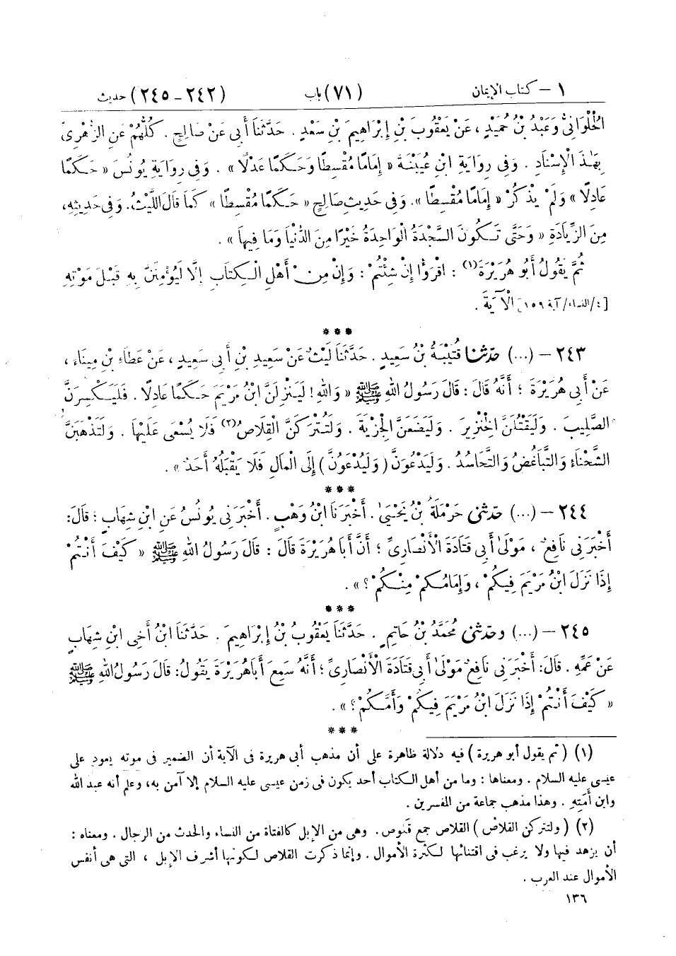 243 - (155) حَدَّثَنَا قُتَيْبَةُ بْنُ سَعِيدٍ، حَدَّثَنَا لَيْثٌ، عَنْ سَعِيدِ بْنِ أَبِي سَعِيدٍ، عَنْ عَطَاءِ بْنِ مِينَاءَ، عَنْ أَبِي هُرَيْرَةَ، أَنَّهُ قَالَ: قَالَ رَسُولُ اللهِ صَلَّى اللهُ عَلَيْهِ وَسَلَّمَ: «وَاللهِ، §لَيَنْزِلَنَّ ابْنُ مَرْيَمَ حَكَمًا عَادِلًا، فَلَيَكْسِرَنَّ الصَّلِيبَ، وَلَيَقْتُلَنَّ الْخِنْزِيرَ، وَلَيَضَعَنَّ الْجِزْيَةَ، وَلَتُتْرَكَنَّ الْقِلَاصُ فَلَا يُسْعَى عَلَيْهَا، وَلَتَذْهَبَنَّ الشَّحْنَاءُ وَالتَّبَاغُضُ وَالتَّحَاسُدُ، وَلَيَدْعُوَنَّ إِلَى الْمَالِ فَلَا يَقْبَلُهُ أَحَدٌ»