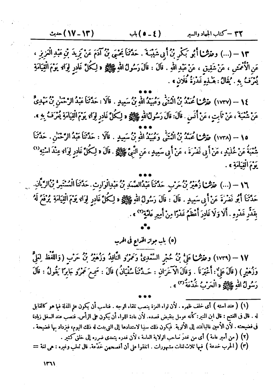 15 - (1738) حَدَّثَنَا مُحَمَّدُ بْنُ الْمُثَنَّى، وَعُبَيْدُ اللهِ بْنُ سَعِيدٍ، قَالَا: حَدَّثَنَا عَبْدُ الرَّحْمَنِ، حَدَّثَنَا شُعْبَةُ، عَنْ خُلَيْدٍ، عَنْ أَبِي نَضْرَةَ، عَنْ أَبِي سَعِيدٍ، عَنِ النَّبِيِّ صَلَّى اللهُ عَلَيْهِ وَسَلَّمَ قَالَ: «§لِكُلِّ غَادِرٍ لِوَاءٌ عِنْدَ اسْتِهِ يَوْمَ الْقِيَامَةِ»