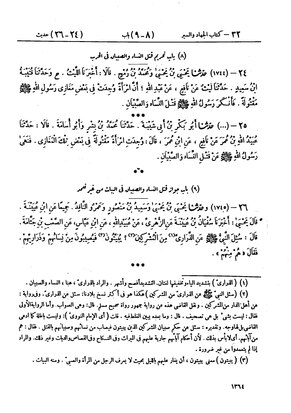 25 - (1744) حَدَّثَنَا أَبُو بَكْرِ بْنُ أَبِي شَيْبَةَ، حَدَّثَنَا مُحَمَّدُ بْنُ بِشْرٍ، وَأَبُو أُسَامَةَ، قَالَا: حَدَّثَنَا عُبَيْدُ اللهِ بْنُ عُمَرَ، عَنْ نَافِعٍ، عَنِ ابْنِ عُمَرَ، قَالَ: «وُجِدَتِ امْرَأَةٌ مَقْتُولَةً فِي بَعْضِ تِلْكَ الْمَغَازِي، §فَنَهَى رَسُولُ اللهِ صَلَّى اللهُ عَلَيْهِ وَسَلَّمَ عَنْ قَتْلِ النِّسَاءِ وَالصِّبْيَانِ»