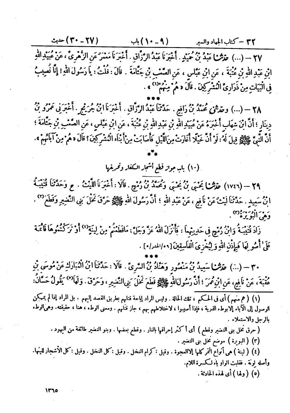 30 - (1746) حَدَّثَنَا سَعِيدُ بْنُ مَنْصُورٍ، وَهَنَّادُ بْنُ السَّرِيِّ، قَالَا: حَدَّثَنَا ابْنُ الْمُبَارَكِ، عَنْ مُوسَى بْنِ عُقْبَةَ، عَنْ نَافِعٍ، عَنِ ابْنِ عُمَرَ، «أَنَّ رَسُولَ اللهِ صَلَّى اللهُ عَلَيْهِ وَسَلَّمَ §قَطَعَ نَخْلَ بَنِي النَّضِيرِ، وَحَرَّقَ»، وَلَهَا يَقُولُ حَسَّانُ: