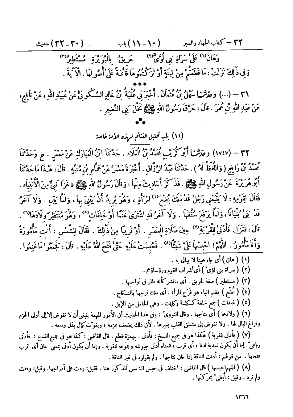 31 - (1746) وحَدَّثَنَا سَهْلُ بْنُ عُثْمَانَ، أَخْبَرَنِي عُقْبَةُ بْنُ خَالِدٍ السَّكُونِيُّ، عَنْ عُبَيْدِ اللهِ، عَنْ نَافِعٍ، عَنْ عَبْدِ اللهِ بْنِ عُمَرَ، قَالَ: «§حَرَّقَ رَسُولُ اللهِ صَلَّى اللهُ عَلَيْهِ وَسَلَّمَ نَخْلَ بَنِي النَّضِيرِ»