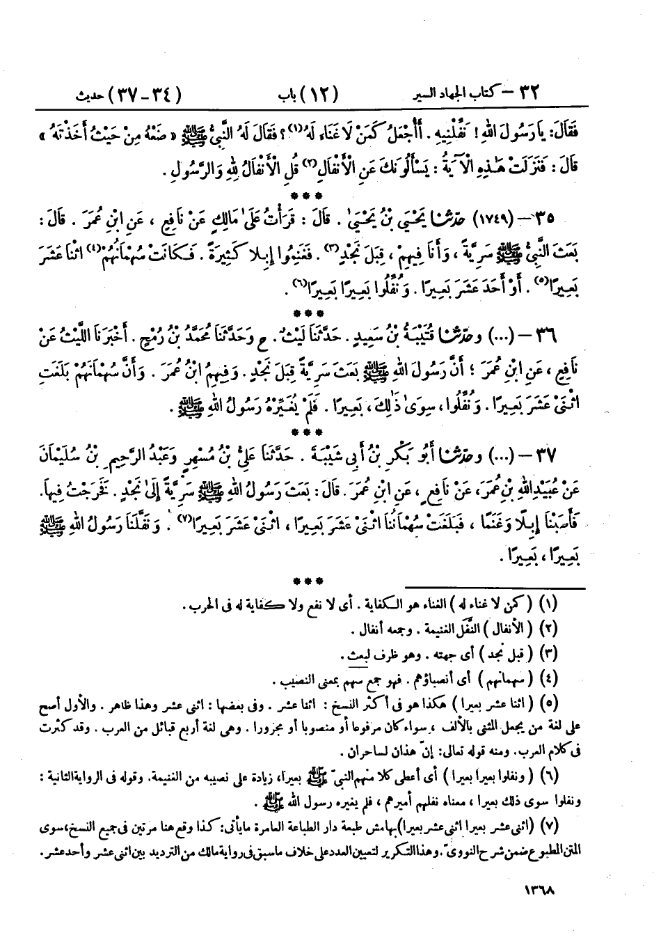 37 - (1749) وحَدَّثَنَا أَبُو بَكْرِ بْنُ أَبِي شَيْبَةَ، حَدَّثَنَا عَلِيُّ بْنُ مُسْهِرٍ، وَعَبْدُ الرَّحِيمِ بْنُ سُلَيْمَانَ، عَنْ عُبَيْدِ اللهِ بْنِ عُمَرَ، عَنْ نَافِعٍ، عَنِ ابْنِ عُمَرَ، قَالَ: «§بَعَثَ رَسُولُ اللهِ صَلَّى اللهُ عَلَيْهِ وَسَلَّمَ سَرِيَّةً إِلَى نَجْدٍ، فَخَرَجْتُ فِيهَا، فَأَصَبْنَا إِبِلًا وَغَنَمًا، فَبَلَغَتْ سُهْمَانُنَا اثْنَيْ عَشَرَ بَعِيرًا، اثْنَيْ عَشَرَ بَعِيرًا، وَنَفَّلَنَا رَسُولُ اللهِ صَلَّى اللهُ عَلَيْهِ وَسَلَّمَ بَعِيرًا بَعِيرًا»،