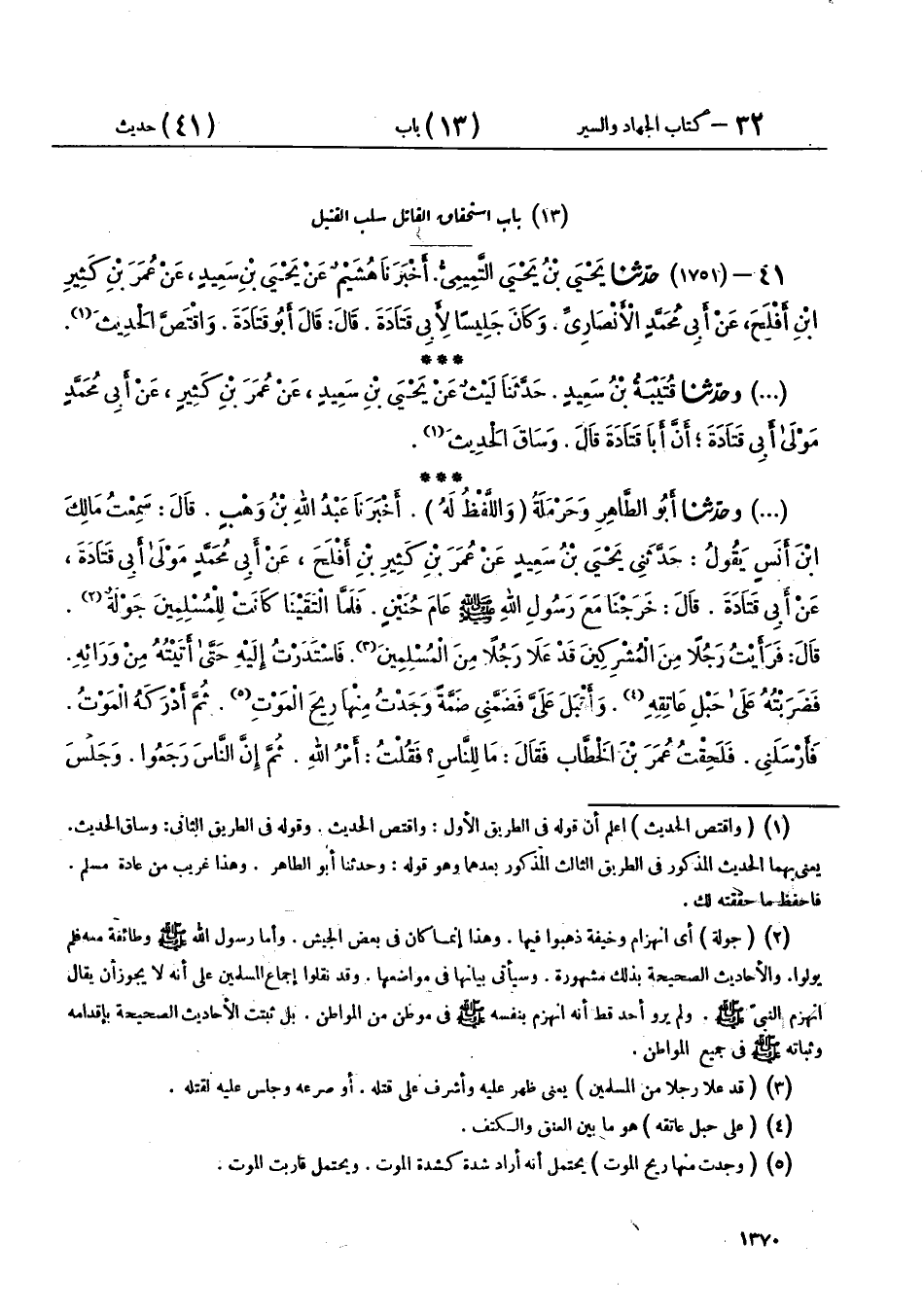 2 - وحَدَّثَنَا أَبُو الطَّاهِرِ، وَحَرْمَلَةُ، وَاللَّفْظُ لَهُ، أَخْبَرَنَا عَبْدُ اللهِ بْنُ وَهْبٍ، قَالَ: سَمِعْتُ مَالِكَ بْنَ أَنَسٍ، يَقُولُ: حَدَّثَنِي يَحْيَى بْنُ سَعِيدٍ، عَنْ عُمَرَ بْنِ كَثِيرِ بْنِ أَفْلَحَ، عَنْ أَبِي مُحَمَّدٍ، مَوْلَى أَبِي قَتَادَةَ، عَنْ أَبِي قَتَادَةَ، قَالَ: خَرَجْنَا مَعَ رَسُولِ اللهِ صَلَّى اللهُ عَلَيْهِ وَسَلَّمَ عَامَ حُنَيْنٍ، فَلَمَّا الْتَقَيْنَا كَانَتْ لِلْمُسْلِمِينَ جَوْلَةٌ، قَالَ: فَرَأَيْتُ رَجُلًا مِنَ الْمُشْرِكِينَ قَدْ عَلَا رَجُلًا مِنَ الْمُسْلِمِينَ، فَاسْتَدَرْتُ إِلَيْهِ حَتَّى أَتَيْتُهُ مِنْ وَرَائِهِ، فَضَرَبْتُهُ عَلَى حَبْلِ عَاتِقِهِ، وَأَقْبَلَ عَلَيَّ فَضَمَّنِي ضَمَّةً وَجَدْتُ مِنْهَا رِيحَ الْمَوْتِ، ثُمَّ أَدْرَكَهُ الْمَوْتُ، فَأَرْسَلَنِي، فَلَحِقْتُ عُمَرَ بْنَ الْخَطَّابِ، فَقَالَ: مَا لِلنَّاسِ؟ فَقُلْتُ: أَمْرُ اللهِ، ثُمَّ إِنَّ النَّاسَ رَجَعُوا وَجَلَسَ -[1371]- رَسُولُ اللهِ صَلَّى اللهُ عَلَيْهِ وَسَلَّمَ، فَقَالَ: «§مَنْ قَتَلَ قَتِيلًا لَهُ عَلَيْهِ بَيِّنَةٌ، فَلَهُ سَلَبُهُ»، قَالَ: فَقُمْتُ، فَقُلْتُ: مَنْ يَشْهَدُ لِي؟ ثُمَّ جَلَسْتُ، ثُمَّ قَالَ مِثْلَ ذَلِكَ، فَقَالَ: فَقُمْتُ، فَقُلْتُ مَنْ يَشْهَدُ لِي؟ ثُمَّ جَلَسْتُ، ثُمَّ قَالَ ذَلِكَ الثَّالِثَةَ، فَقُمْتُ، فَقَالَ رَسُولُ اللهِ صَلَّى اللهُ عَلَيْهِ وَسَلَّمَ: «مَا لَكَ يَا أَبَا قَتَادَةَ؟» فَقَصَصْتُ عَلَيْهِ الْقِصَّةَ، فَقَالَ رَجُلٌ مِنَ الْقَوْمِ: صَدَقَ يَا رَسُولَ اللهِ، سَلَبُ ذَلِكَ الْقَتِيلِ عِنْدِي، فَأَرْضِهِ مِنْ حَقِّهِ، وَقَالَ أَبُو بَكْرٍ الصِّدِّيقُ: لَا هَا اللهِ، إِذًا لَا يَعْمِدُ إِلَى أَسَدٍ مِنْ أُسُدِ اللهِ، يُقَاتِلُ عَنِ اللهِ وَعَنْ رَسُولِهِ فَيُعْطِيكَ سَلَبَهُ، فَقَالَ رَسُولُ اللهِ صَلَّى اللهُ عَلَيْهِ وَسَلَّمَ: «صَدَقَ، فَأَعْطِهِ إِيَّاهُ»، فَأَعْطَانِي، قَالَ: فَبِعْتُ الدِّرْعَ، فَابْتَعْتُ بِهِ مَخْرَفًا فِي بَنِي سَلِمَةَ، فَإِنَّهُ لَأَوَّلُ مَالٍ تَأَثَّلْتُهُ فِي الْإِسْلَامِ، وَفِي حَدِيثِ اللَّيْثِ، فَقَالَ أَبُو بَكْرٍ: كَلَّا لَا يُعْطِيهِ، أُصَيْبِغَ مِنْ قُرَيْشٍ وَيَدَعُ أَسَدًا مِنْ أُسُدِ اللهِ، وَفِي حَدِيثِ اللَّيْثِ، لَأَوَّلُ مَالٍ تَأَثَّلْتُهُ