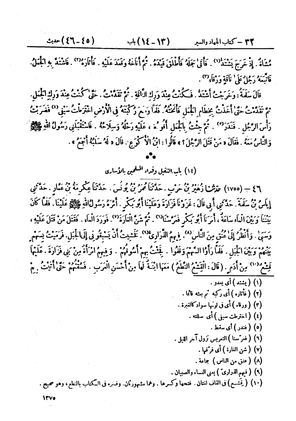 46 - (1755) حَدَّثَنَا زُهَيْرُ بْنُ حَرْبٍ، حَدَّثَنَا عُمَرُ بْنُ يُونُسَ، حَدَّثَنَا عِكْرِمَةُ بْنُ عَمَّارٍ، حَدَّثَنِي إِيَاسُ بْنُ سَلَمَةَ، حَدَّثَنِي أَبِي، قَالَ: غَزَوْنَا فَزَارَةَ وَعَلَيْنَا أَبُو بَكْرٍ، أَمَّرَهُ رَسُولُ اللهِ صَلَّى اللهُ عَلَيْهِ وَسَلَّمَ عَلَيْنَا، فَلَمَّا كَانَ بَيْنَنَا وَبَيْنَ الْمَاءِ سَاعَةٌ، أَمَرَنَا أَبُو بَكْرٍ فَعَرَّسْنَا، ثُمَّ شَنَّ الْغَارَةَ، فَوَرَدَ الْمَاءَ، فَقَتَلَ مَنْ قَتَلَ عَلَيْهِ، وَسَبَى، وَأَنْظُرُ إِلَى عُنُقٍ مِنَ النَّاسِ فِيهِمُ الذَّرَارِيُّ، فَخَشِيتُ أَنْ يَسْبِقُونِي إِلَى الْجَبَلِ، فَرَمَيْتُ بِسَهْمٍ بَيْنهُمْ وَبَيْنَ الْجَبَلِ، فَلَمَّا رَأَوُا السَّهْمَ وَقَفُوا، فَجِئْتُ بِهِمْ أَسُوقُهُمْ وَفِيهِمِ امْرَأَةٌ مِنْ بَنِي فَزَارَةَ عَلَيْهَا قَشْعٌ مِنْ أَدَمٍ - قَالَ: الْقَشْعُ: النِّطْعُ - مَعَهَا ابْنَةٌ لَهَا مِنْ أَحْسَنِ الْعَرَبِ، فَسُقْتُهُمْ حَتَّى أَتَيْتُ بِهِمْ أَبَا بَكْرٍ، فَنَفَّلَنِي أَبُو بَكْرٍ ابْنَتَهَا، فَقَدِمْنَا الْمَدِينَةَ وَمَا كَشَفْتُ لَهَا ثَوْبًا، فَلَقِيَنِي رَسُولُ اللهِ صَلَّى اللهُ عَلَيْهِ وَسَلَّمَ فِي السُّوقِ، فَقَالَ: «يَا سَلَمَةُ، §هَبْ لِي الْمَرْأَةَ»، فَقُلْتُ: يَا رَسُولَ اللهِ، وَاللهِ لَقَدْ أَعْجَبَتْنِي وَمَا كَشَفْتُ لَهَا ثَوْبًا، ثُمَّ لَقِيَنِي رَسُولُ اللهِ صَلَّى اللهُ عَلَيْهِ وَسَلَّمَ مِنَ الْغَدِ فِي السُّوقِ، فَقَالَ لِي: «يَا سَلَمَةُ، هَبْ لِي الْمَرْأَةَ لِلَّهِ أَبُوكَ»، فَقُلْتُ: هِيَ لَكَ يَا رَسُولَ اللهِ، فَوَاللهِ مَا كَشَفْتُ لَهَا ثَوْبًا، فَبَعَثَ بِهَا رَسُولُ اللهِ صَلَّى اللهُ عَلَيْهِ وَسَلَّمَ إِلَى أَهْلِ مَكَّةَ، فَفَدَى بِهَا نَاسًا مِنَ الْمُسْلِمِينَ كَانُوا أُسِرُوا بِمَكَّةَ