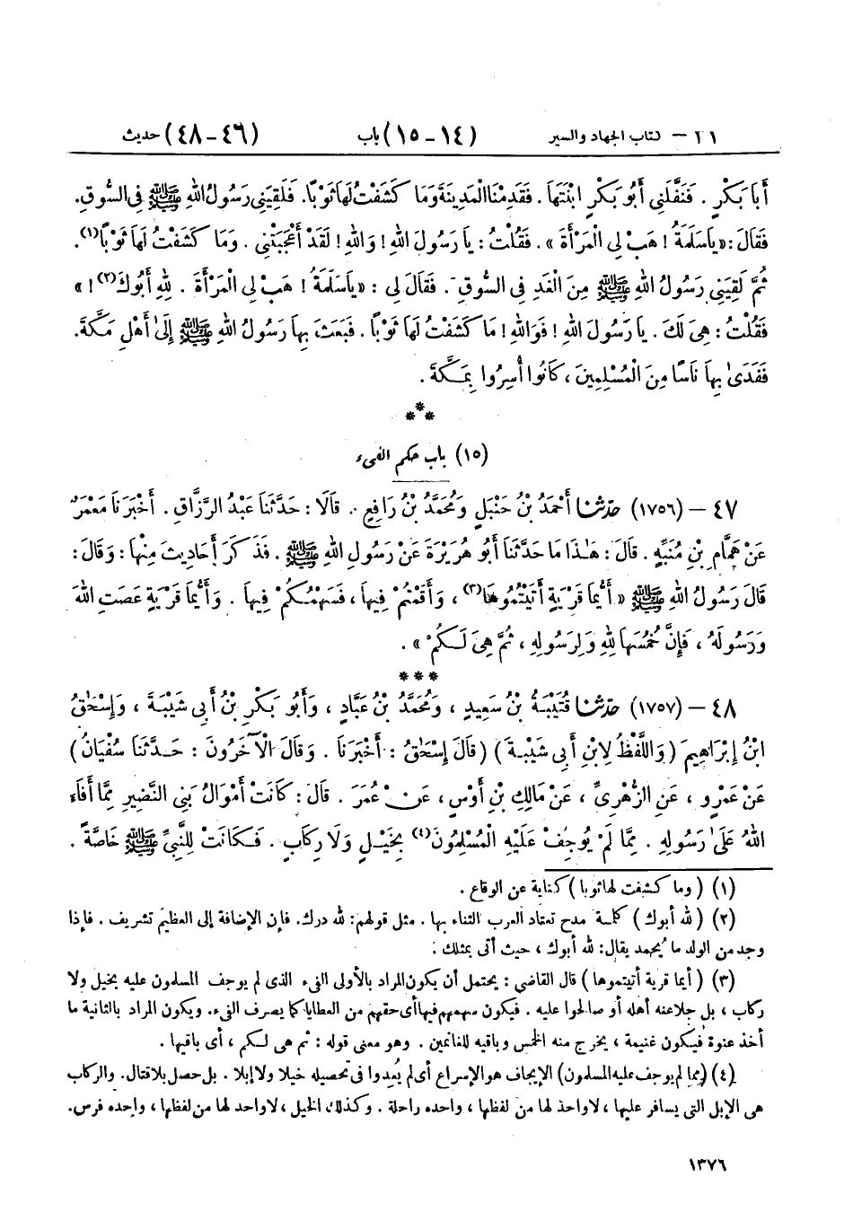 48 - (1757) حَدَّثَنَا قُتَيْبَةُ بْنُ سَعِيدٍ، وَمُحَمَّدُ بْنُ عَبَّادٍ، وَأَبُو بَكْرِ بْنُ أَبِي شَيْبَةَ، وَإِسْحَاقُ بْنُ إِبْرَاهِيمَ، وَاللَّفْظُ لِابْنِ أَبِي شَيْبَةَ، قَالَ إِسْحَاقُ: أَخْبَرَنَا، وقَالَ الْآخَرُونَ: حَدَّثَنَا سُفْيَانُ، عَنْ عَمْرٍو، عَنِ الزُّهْرِيِّ، عَنْ مَالِكِ بْنِ أَوْسٍ، عَنْ عُمَرَ، قَالَ: «كَانَتْ أَمْوَالُ بَنِي النَّضِيرِ مِمَّا أَفَاءَ اللهُ عَلَى رَسُولِهِ، مِمَّا لَمْ يُوجِفْ عَلَيْهِ الْمُسْلِمُونَ بِخَيْلٍ وَلَا رِكَابٍ، فَكَانَتْ لِلنَّبِيِّ صَلَّى اللهُ عَلَيْهِ وَسَلَّمَ خَاصَّةً، فَكَانَ §يُنْفِقُ عَلَى أَهْلِهِ نَفَقَةَ سَنَةٍ، وَمَا بَقِيَ يَجْعَلُهُ فِي الْكُرَاعِ وَالسِّلَاحِ، عُدَّةً فِي سَبِيلِ اللهِ»،