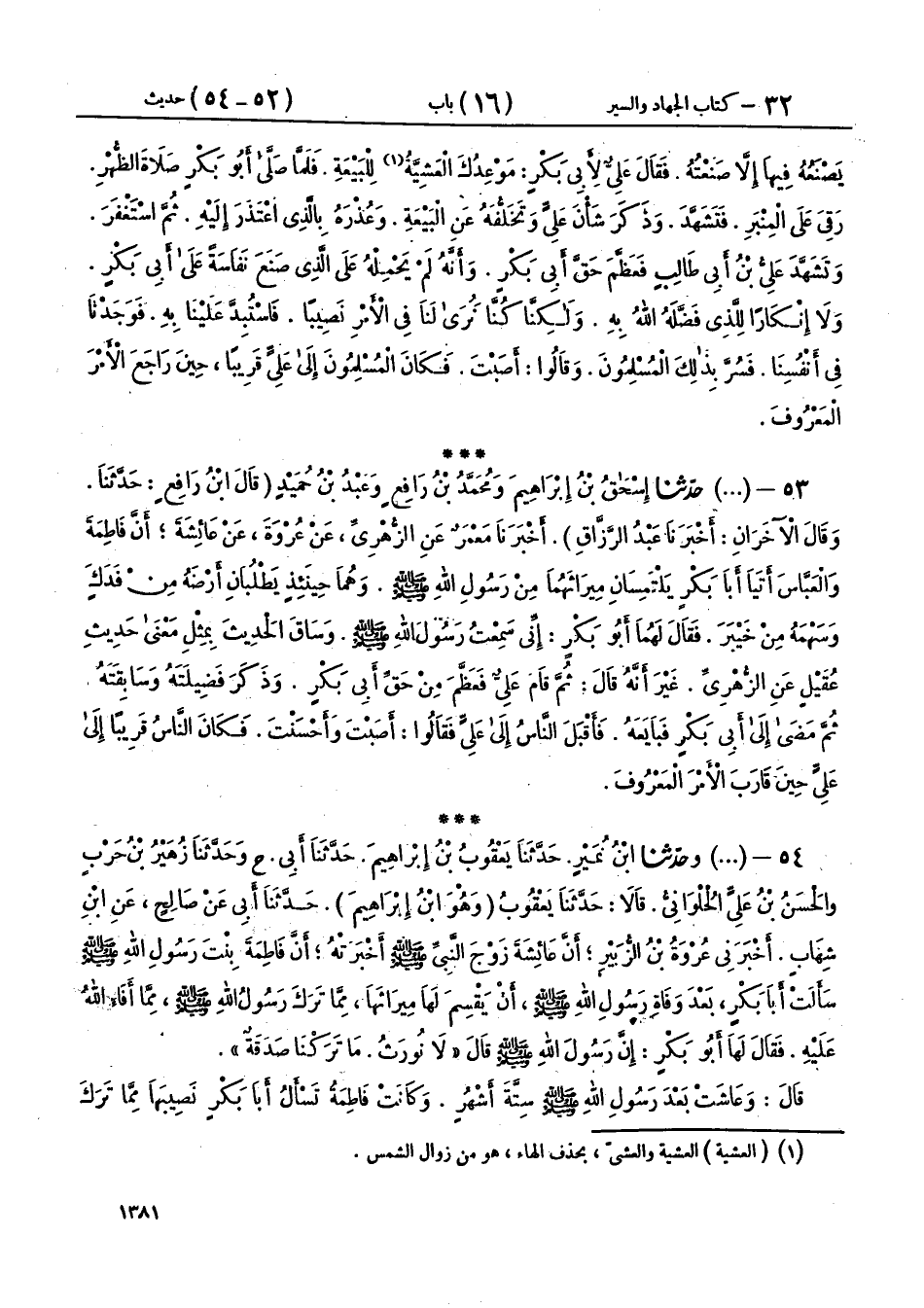 53 - (1759) حَدَّثَنَا إِسْحَاقُ بْنُ إِبْرَاهِيمَ، وَمُحَمَّدُ بْنُ رَافِعٍ، وَعَبْدُ بْنُ حُمَيْدٍ، قَالَ ابْنُ رَافِعٍ: حَدَّثَنَا، وقَالَ الْآخَرَانِ: أَخْبَرَنَا عَبْدُ الرَّزَّاقِ، أَخْبَرَنَا مَعْمَرٌ، عَنِ الزُّهْرِيِّ، عَنْ عُرْوَةَ، عَنْ عَائِشَةَ، أَنَّ فَاطِمَةَ وَالْعَبَّاسَ أَتَيَا أَبَا بَكْرٍ يَلْتَمِسَانِ مِيرَاثَهُمَا مِنْ رَسُولِ اللهِ صَلَّى اللهُ عَلَيْهِ وَسَلَّمَ، وَهُمَا حِينَئِذٍ يَطْلُبَانِ أَرْضَهُ مِنْ فَدَكٍ، وَسَهْمَهُ مِنْ خَيْبَرَ، فَقَالَ لَهُمَا أَبُو بَكْرٍ: إِنِّي سَمِعْتُ رَسُولَ اللهِ صَلَّى اللهُ عَلَيْهِ وَسَلَّمَ وَسَاقَ الْحَدِيثَ بِمِثْلِ مَعْنَى حَدِيثِ عُقَيْلٍ، عَنِ الزُّهْرِيِّ غَيْرَ أَنَّهُ قَالَ: ثُمَّ قَامَ عَلِيٌّ فَعَظَّمَ مِنْ حَقِّ أَبِي بَكْرٍ وَذَكَرَ فَضِيلَتَهُ وَسَابِقَتَهُ، ثُمَّ مَضَى إِلَى أَبِي بَكْرٍ فَبَايَعَهُ، فَأَقْبَلَ النَّاسُ إِلَى عَلِيٍّ، فَقَالُوا: أَصَبْتَ وَأَحْسَنْتَ، فَكَانَ النَّاسُ قَرِيبًا إِلَى عَلِيٍّ حِينَ قَارَبَ الْأَمْرَ الْمَعْرُوفَ