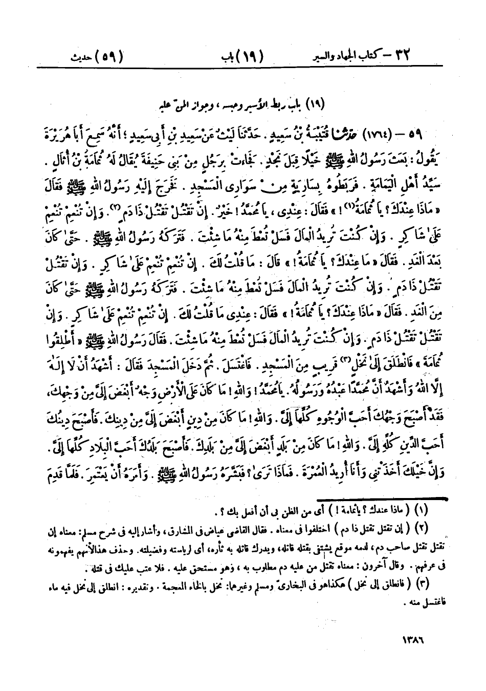 19 - بَابُ رَبْطِ الْأَسِيرِ وَحَبْسِهِ، وَجَوَازِ الْمَنِّ عَلَيْهِ