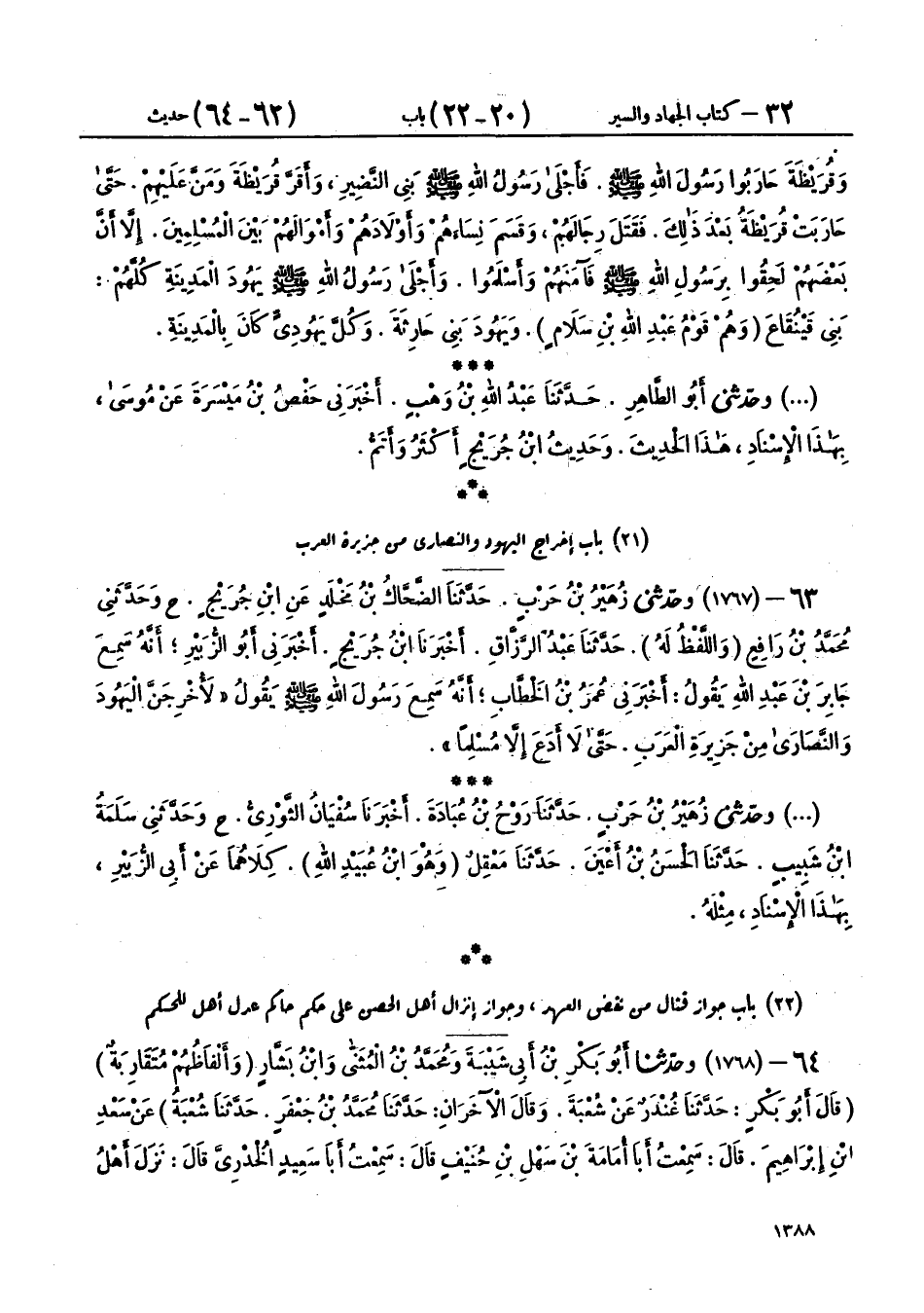 63 - (1767) وحَدَّثَنِي زُهَيْرُ بْنُ حَرْبٍ، حَدَّثَنَا الضَّحَّاكُ بْنُ مَخْلَدٍ، عَنِ ابْنِ جُرَيْجٍ، ح وحَدَّثَنِي مُحَمَّدُ بْنُ رَافِعٍ، وَاللَّفْظُ لَهُ، حَدَّثَنَا عَبْدُ الرَّزَّاقِ، أَخْبَرَنَا ابْنُ جُرَيْجٍ، أَخْبَرَنِي أَبُو الزُّبَيْرِ، أَنَّهُ سَمِعَ جَابِرَ بْنَ عَبْدِ اللهِ، يَقُولُ: أَخْبَرَنِي عُمَرُ بْنُ الْخَطَّابِ، أَنَّهُ سَمِعَ رَسُولَ اللهِ صَلَّى اللهُ عَلَيْهِ وَسَلَّمَ يَقُولُ: «§لَأُخْرِجَنَّ الْيَهُودَ، وَالنَّصَارَى مِنْ جَزِيرَةِ الْعَرَبِ حَتَّى لَا أَدَعَ إِلَّا مُسْلِمًا»،