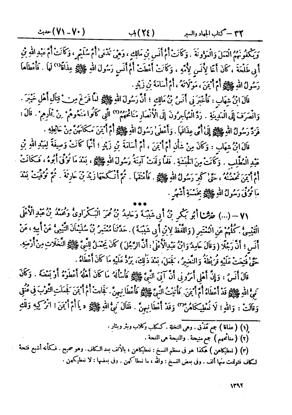 71 - (1771) حَدَّثَنَا أَبُو بَكْرِ بْنُ أَبِي شَيْبَةَ، وَحَامِدُ بْنُ عُمَرَ الْبَكْرَاوِيُّ، وَمُحَمَّدُ بْنُ عَبْدِ الْأَعْلَى الْقَيْسِيُّ، كُلُّهُمْ عَنِ الْمُعْتَمِرِ، وَاللَّفْظُ لِابْنِ أَبِي شَيْبَةَ، حَدَّثَنَا مُعْتَمِرُ بْنُ سُلَيْمَانَ التَّيْمِيُّ، عَنْ أَبِيهِ، عَنْ أَنَسٍ، أَنَّ رَجُلًا، - وَقَالَ حَامِدٌ، وَابْنُ عَبْدِ الْأَعْلَى أَنَّ الرَّجُلَ - كَانَ يَجْعَلُ لِلنَّبِيِّ صَلَّى اللهُ عَلَيْهِ وَسَلَّمَ النَّخَلَاتِ مِنْ أَرْضِهِ حَتَّى فُتِحَتْ عَلَيْهِ قُرَيْظَةُ وَالنَّضِيرُ، فَجَعَلَ بَعْدَ ذَلِكَ يَرُدُّ عَلَيْهِ مَا كَانَ أَعْطَاهُ، قَالَ أَنَسٌ: وَإِنَّ أَهْلِي أَمَرُونِي أَنْ آتِيَ النَّبِيَّ صَلَّى اللهُ عَلَيْهِ وَسَلَّمَ، فَأَسْأَلَهُ مَا كَانَ أَهْلُهُ أَعْطَوْهُ أَوْ بَعْضَهُ، وَكَانَ نَبِيُّ اللهِ صَلَّى اللهُ عَلَيْهِ وَسَلَّمَ قَدْ أَعْطَاهُ أُمَّ أَيْمَنَ، فَأَتَيْتُ النَّبِيَّ صَلَّى اللهُ عَلَيْهِ وَسَلَّمَ فَأَعْطَانِيهِنَّ، فَجَاءَتْ أُمُّ أَيْمَنَ فَجَعَلَتِ الثَّوْبَ فِي عُنُقِي، وَقَالَتْ: وَاللهِ، لَا نُعْطِيكَاهُنَّ وَقَدْ أَعْطَانِيهِنَّ، فَقَالَ نَبِيُّ اللهِ صَلَّى اللهُ عَلَيْهِ وَسَلَّمَ: «§يَا أُمَّ أَيْمَنَ، اتْرُكِيهِ وَلَكِ كَذَا وَكَذَا»، وَتَقُولُ: كَلَّا وَالَّذِي لَا إِلَهَ إِلَّا هُوَ، فَجَعَلَ يَقُولُ: كَذَا حَتَّى أَعْطَاهَا عَشْرَةَ أَمْثَالِهِ أَوْ قَرِيبًا مِنْ عَشَرَةِ أَمْثَالِهِ