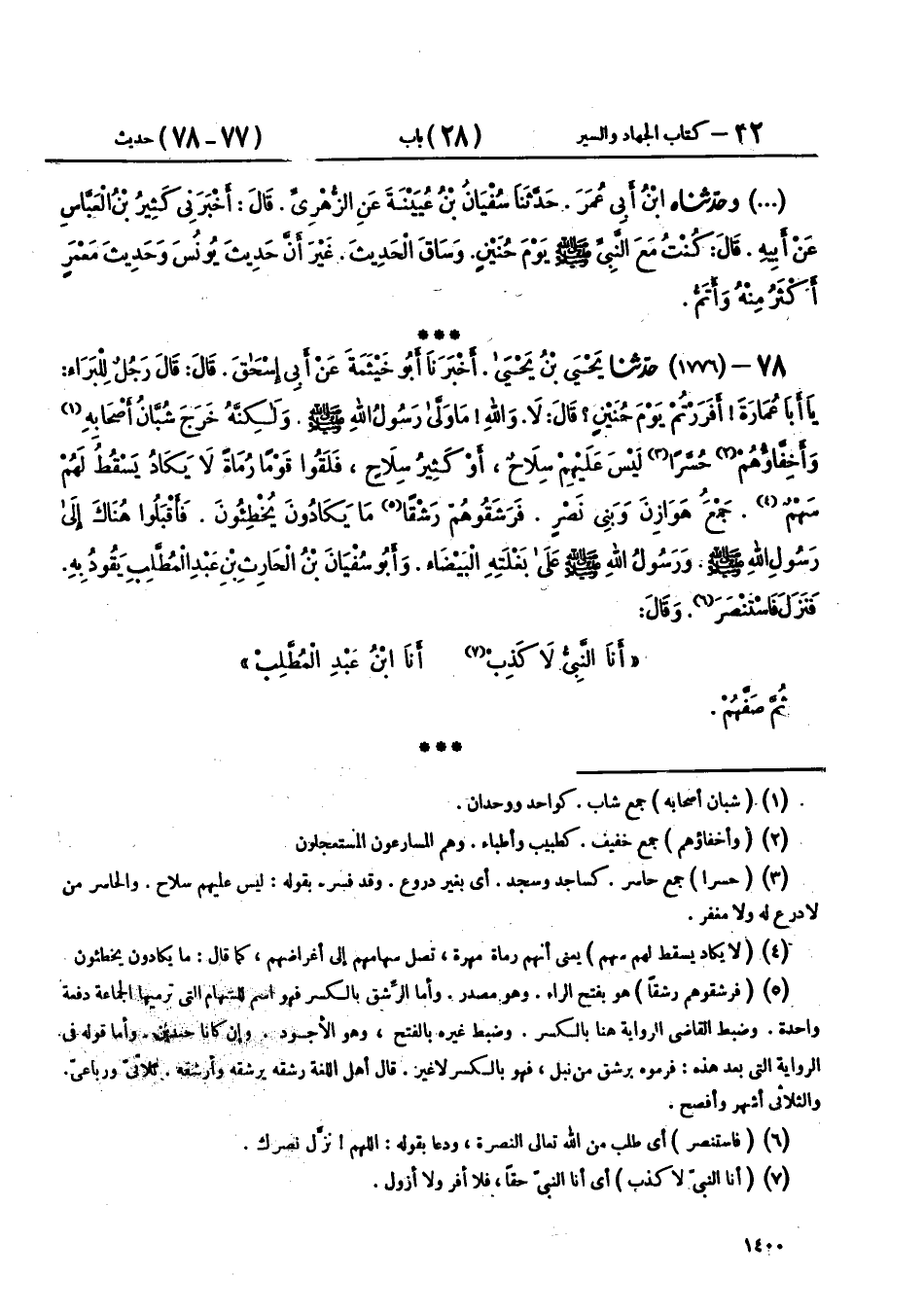 78 - (1776) حَدَّثَنَا يَحْيَى بْنُ يَحْيَى، أَخْبَرَنَا أَبُو خَيْثَمَةَ، عَنْ أَبِي إِسْحَاقَ، قَالَ: قَالَ رَجُلٌ لِلْبَرَاءِ: يَا أَبَا عُمَارَةَ، أَفَرَرْتُمْ يَوْمَ حُنَيْنٍ؟ قَالَ: لَا وَاللهِ، مَا وَلَّى رَسُولُ اللهِ صَلَّى اللهُ عَلَيْهِ وَسَلَّمَ، وَلَكِنَّهُ خَرَجَ شُبَّانُ أَصْحَابِهِ، وَأَخِفَّاؤُهُمْ حُسَّرًا، لَيْسَ عَلَيْهِمْ سِلَاحٌ - أَوْ كَثِيرُ سِلَاحٍ -، فَلَقُوا قَوْمًا رُمَاةً لَا يَكَادُ يَسْقُطُ لَهُمْ سَهْمٌ، جَمْعَ هَوَازِنَ وَبَنِي نَصْرٍ، فَرَشَقُوهُمْ رَشْقًا مَا يَكَادُونَ يُخْطِئُونَ، فَأَقْبَلُوا هُنَاكَ إِلَى رَسُولِ اللهِ صَلَّى اللهُ عَلَيْهِ وَسَلَّمَ، وَرَسُولُ اللهِ صَلَّى اللهُ عَلَيْهِ وَسَلَّمَ عَلَى بَغْلَتِهِ الْبَيْضَاءِ، وَأَبُو سُفْيَانَ بْنُ الْحَارِثِ بْنِ عَبْدِ الْمُطَّلِبِ يَقُودُ بِهِ، فَنَزَلَ فَاسْتَنْصَرَ، وَقَالَ: «§أَنَا النَّبِيُّ لَا كَذِبْ، أَنَا ابْنُ عَبْدِ الْمُطَّلِبْ»، ثُمَّ صَفَّهُمْ