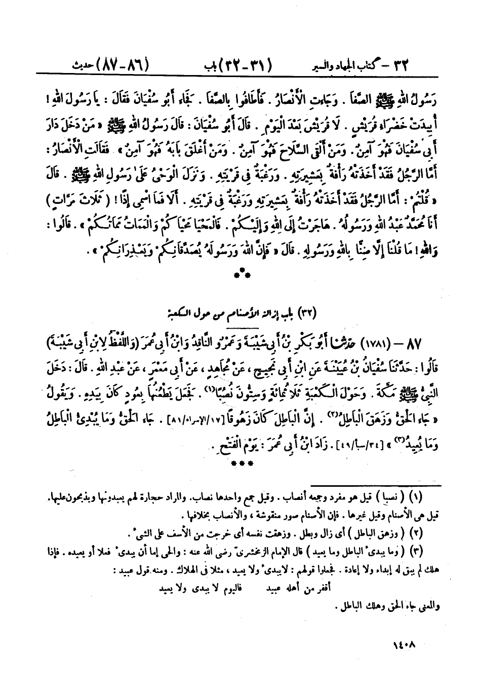 87 - (1781) حَدَّثَنَا أَبُو بَكْرِ بْنُ أَبِي شَيْبَةَ، وَعَمْرٌو النَّاقِدُ، وَابْنُ أَبِي عُمَرَ، وَاللَّفْظُ لِابْنِ أَبِي شَيْبَةَ، قَالُوا: حَدَّثَنَا سُفْيَانُ بْنُ عُيَيْنَةَ، عَنِ ابْنِ أَبِي نَجِيحٍ، عَنْ مُجَاهِدٍ، عَنْ أَبِي مَعْمَرٍ، عَنْ عَبْدِ اللهِ، قَالَ: دَخَلَ النَّبِيُّ صَلَّى اللهُ عَلَيْهِ وَسَلَّمَ مَكَّةَ، وَحَوْلَ الْكَعْبَةِ ثَلَاثُ مِائَةٍ وَسِتُّونَ نُصُبًا، فَجَعَلَ يَطْعُنُهَا بِعُودٍ كَانَ بِيَدِهِ، وَيَقُولُ: {§جَاءَ الْحَقُّ وَزَهَقَ الْبَاطِلُ إِنَّ الْبَاطِلَ كَانَ زَهُوقًا} [الإسراء: 81] {جَاءَ الْحَقُّ وَمَا يُبْدِئُ الْبَاطِلُ وَمَا يُعِيدُ} [سبأ: 49]، زَادَ ابْنُ أَبِي عُمَرَ: يَوْمَ الْفَتْحِ،