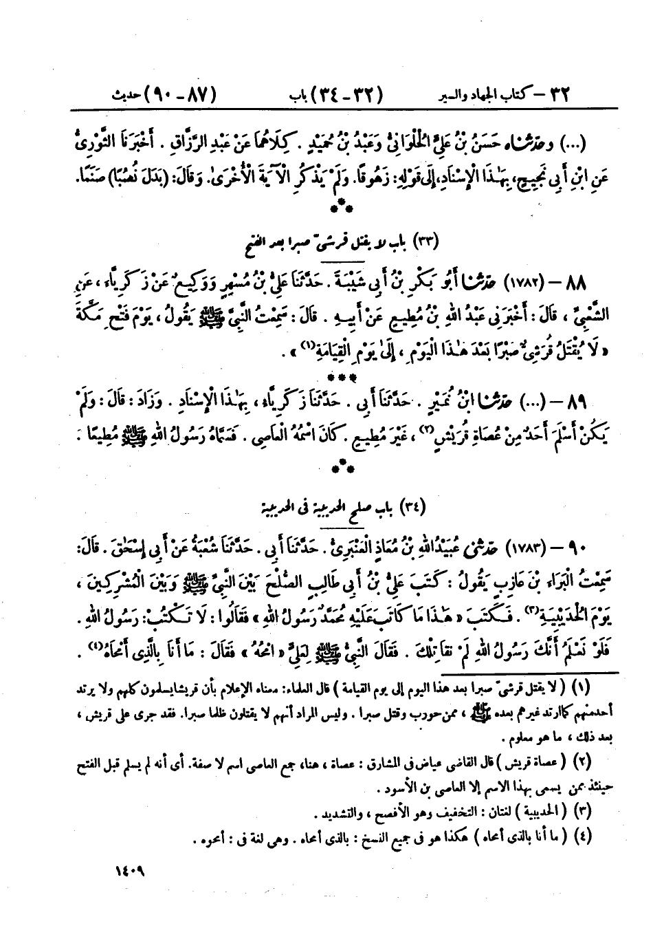 88 - (1782) حَدَّثَنَا أَبُو بَكْرِ بْنُ أَبِي شَيْبَةَ، حَدَّثَنَا عَلِيُّ بْنُ مُسْهِرٍ، وَوَكِيعٌ، عَنْ زَكَرِيَّا، عَنِ الشَّعْبِيِّ، قَالَ: أَخْبَرَنِي عَبْدُ اللهِ بْنُ مُطِيعٍ، عَنْ أَبِيهِ، قَالَ: سَمِعْتُ النَّبِيَّ صَلَّى اللهُ عَلَيْهِ وَسَلَّمَ، يَقُولُ يَوْمَ فَتْحِ مَكَّةَ: «§لَا يُقْتَلُ قُرَشِيٌّ صَبْرًا بَعْدَ هَذَا الْيَوْمِ إِلَى يَوْمِ الْقِيَامَةِ»،