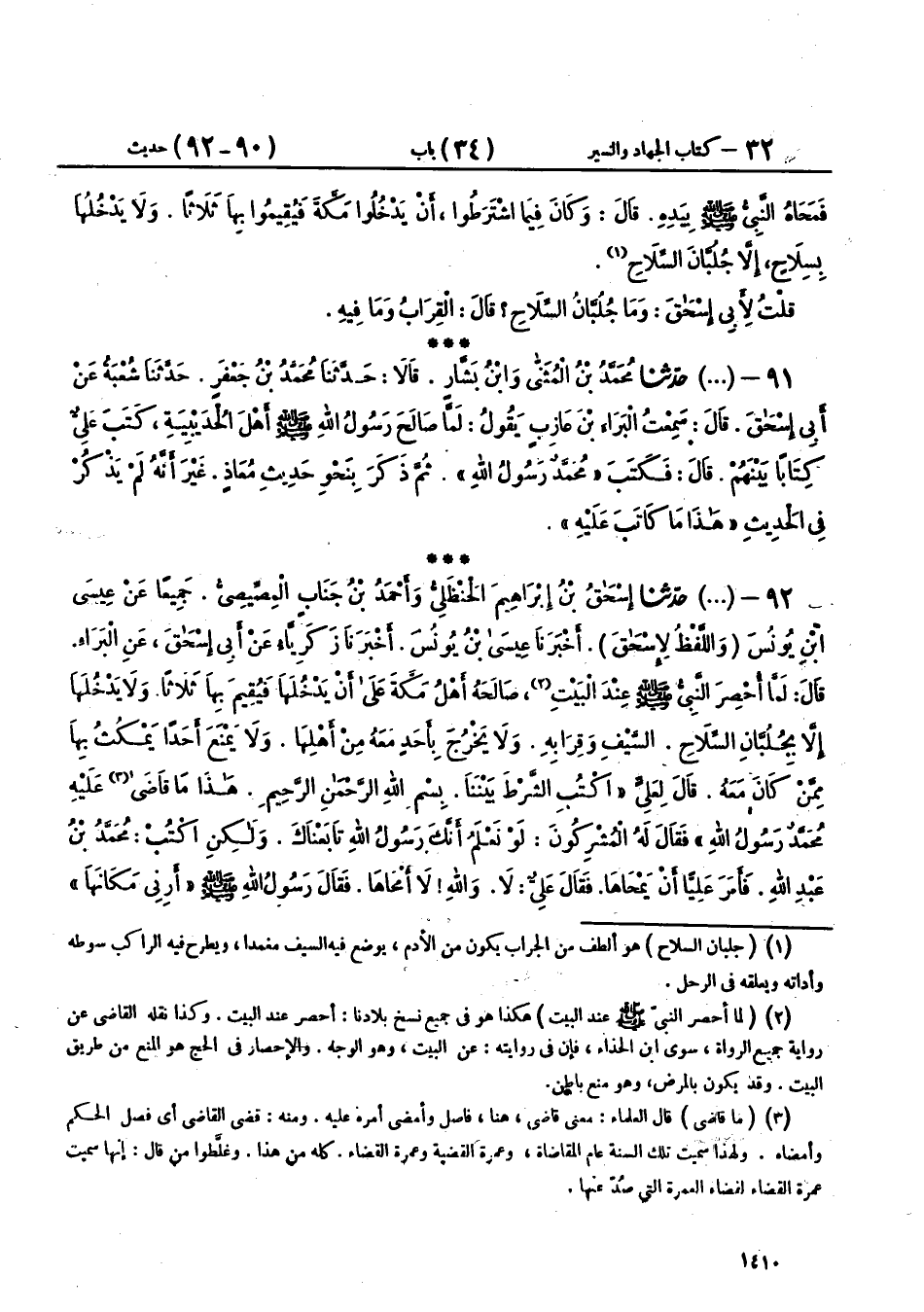 92 - (1783) حَدَّثَنَا إِسْحَاقُ بْنُ إِبْرَاهِيمَ الْحَنْظَلِيُّ، وَأَحْمَدُ بْنُ جَنَابٍ الْمِصِّيصِيُّ، جَمِيعًا عَنْ عِيسَى بْنِ يُونُسَ، وَاللَّفْظُ لِإِسْحَاقَ، أَخْبَرَنَا عِيسَى بْنُ يُونُسَ، أَخْبَرَنَا زَكَرِيَّا، عَنْ أَبِي إِسْحَاقَ، عَنِ الْبَرَاءِ، قَالَ: لَمَّا أُحْصِرَ النَّبِيُّ صَلَّى اللهُ عَلَيْهِ وَسَلَّمَ عِنْدَ الْبَيْتِ، صَالَحَهُ أَهْلُ مَكَّةَ عَلَى أَنْ يَدْخُلَهَا فَيُقِيمَ بِهَا ثَلَاثًا، وَلَا يَدْخُلَهَا إِلَّا بِجُلُبَّانِ السِّلَاحِ، السَّيْفِ وَقِرَابِهِ، وَلَا يَخْرُجَ بِأَحَدٍ مَعَهُ مِنْ أَهْلِهَا، وَلَا يَمْنَعَ أَحَدًا يَمْكُثُ بِهَا مِمَّنْ كَانَ مَعَهُ، قَالَ لِعَلِيٍّ: «اكْتُبِ الشَّرْطَ بَيْنَنَا، بِسْمِ اللهِ الرَّحْمَنِ الرَّحِيمِ، §هَذَا مَا قَاضَى عَلَيْهِ مُحَمَّدٌ رَسُولُ اللهِ»، فَقَالَ لَهُ الْمُشْرِكُونَ: لَوْ نَعْلَمُ أَنَّكَ رَسُولُ اللهِ تَابَعْنَاكَ، وَلَكِنِ اكْتُبْ مُحَمَّدُ بْنُ عَبْدِ اللهِ، فَأَمَرَ عَلِيًّا أَنْ يَمْحَاهَا، فَقَالَ عَلِيٌّ: لَا وَاللهِ، لَا أَمْحَاهَا، فَقَالَ رَسُولُ اللهِ صَلَّى اللهُ عَلَيْهِ وَسَلَّمَ: «أَرِنِي مَكَانَهَا»، فَأَرَاهُ مَكَانَهَا فَمَحَاهَا، وَكَتَبَ ابْنُ عَبْدِ اللهِ، فَأَقَامَ بِهَا ثَلَاثَةَ أَيَّامٍ، فَلَمَّا أَنْ كَانَ يَوْمُ الثَّالِثِ قَالُوا لِعَلِيٍّ: هَذَا آخِرُ يَوْمٍ مِنْ شَرْطِ صَاحِبِكَ، فَأْمُرْهُ فَلْيَخْرُجْ فَأَخْبَرَهُ بِذَلِكَ، فَقَالَ: «نَعَمْ»، فَخَرَجَ، وقَالَ ابْنُ جَنَابٍ فِي رِوَايَتِهِ مَكَانَ تَابَعْنَاكَ: بَايَعْنَاكَ
