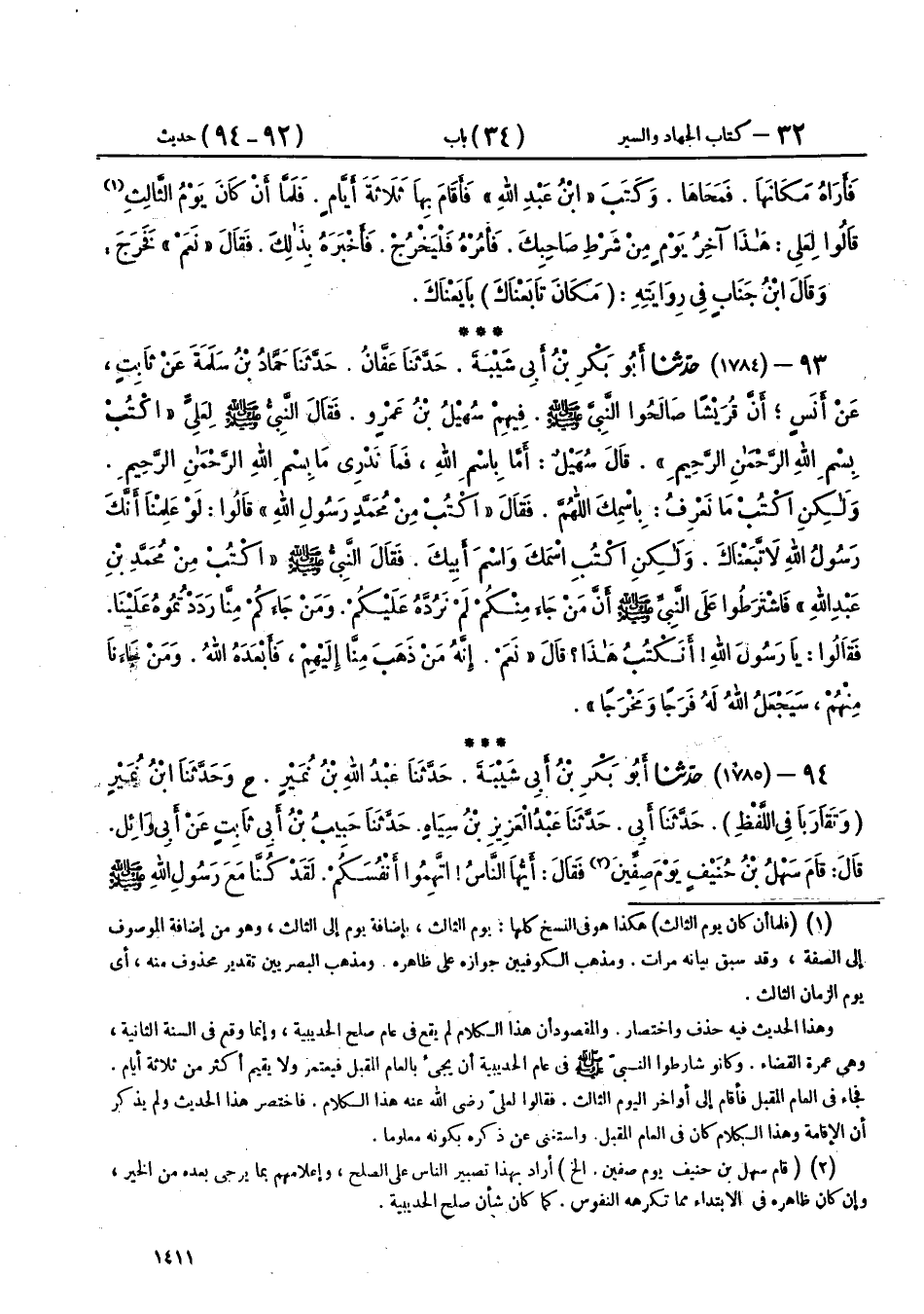 94 - (1785) حَدَّثَنَا أَبُو بَكْرِ بْنُ أَبِي شَيْبَةَ، حَدَّثَنَا عَبْدُ اللهِ بْنُ نُمَيْرٍ، ح وحَدَّثَنَا ابْنُ نُمَيْرٍ، وَتَقَارَبَا فِي اللَّفْظِ، حَدَّثَنَا أَبِي، حَدَّثَنَا عَبْدُ الْعَزِيزِ بْنُ سِيَاهٍ، حَدَّثَنَا حَبِيبُ بْنُ أَبِي ثَابِتٍ، عَنْ أَبِي وَائِلٍ، قَالَ: قَامَ سَهْلُ بْنُ حُنَيْفٍ يَوْمَ صِفِّينَ، فَقَالَ: أَيُّهَا النَّاسُ، اتَّهِمُوا أَنْفُسَكُمْ، لَقَدْ كُنَّا مَعَ رَسُولِ اللهِ صَلَّى اللهُ عَلَيْهِ وَسَلَّمَ يَوْمَ الْحُدَيْبِيَةِ وَلَوْ نَرَى قِتَالًا لَقَاتَلْنَا، وَذَلِكَ فِي الصُّلْحِ الَّذِي كَانَ بَيْنَ رَسُولِ اللهِ صَلَّى اللهُ عَلَيْهِ وَسَلَّمَ وَبَيْنَ الْمُشْرِكِينَ، فَجَاءَ عُمَرُ بْنُ الْخَطَّابِ، فَأَتَى رَسُولَ اللهِ صَلَّى اللهُ عَلَيْهِ وَسَلَّمَ، فَقَالَ: يَا رَسُولَ اللهِ، أَلَسْنَا عَلَى حَقٍّ وَهُمْ عَلَى بَاطِلٍ؟ قَالَ: «بَلَى»، قَالَ: أَلَيْسَ قَتْلَانَا فِي الْجَنَّةِ وَقَتْلَاهُمْ فِي النَّارِ؟ قَالَ: «بَلَى»، قَالَ: فَفِيمَ نُعْطِي الدَّنِيَّةَ فِي دِينِنَا، وَنَرْجِعُ، وَلَمَّا يَحْكُمِ اللهُ بَيْنَنَا وَبَيْنَهُمْ، فَقَالَ: «يَا ابْنَ الْخَطَّابِ، §إِنِّي رَسُولُ اللهِ وَلَنْ يُضَيِّعَنِي اللهُ أَبَدًا»، قَالَ: فَانْطَلَقَ عُمَرُ فَلَمْ يَصْبِرْ مُتَغَيِّظًا، فَأَتَى أَبَا بَكْرٍ، فَقَالَ: يَا أَبَا بَكْرٍ أَلَسْنَا عَلَى حَقٍّ وَهُمْ عَلَى بَاطِلٍ؟ قَالَ: بَلَى، قَالَ: أَلَيْسَ قَتْلَانَا فِي الْجَنَّةِ وَقَتْلَاهُمْ فِي النَّارِ؟ قَالَ: بَلَى، قَالَ: فَعَلَامَ نُعْطِي الدَّنِيَّةَ فِي دِينِنَا، وَنَرْجِعُ وَلَمَّا يَحْكُمِ اللهُ بَيْنَنَا وَبَيْنَهُمْ؟ فَقَالَ: يَا ابْنَ الْخَطَّابِ، إِنَّهُ رَسُولُ اللهِ وَلَنْ يُضَيِّعَهُ اللهُ أَبَدًا، قَالَ: فَنَزَلَ الْقُرْآنُ عَلَى رَسُولِ اللهِ صَلَّى اللهُ عَلَيْهِ وَسَلَّمَ بِالْفَتْحِ، فَأَرْسَلَ إِلَى عُمَرَ، فَأَقْرَأَهُ إِيَّاهُ، فَقَالَ: يَا رَسُولَ اللهِ، أَوْ فَتْحٌ هُو؟ قَالَ: «نَعَمْ»، فَطَابَتْ نَفْسُهُ وَرَجَعَ