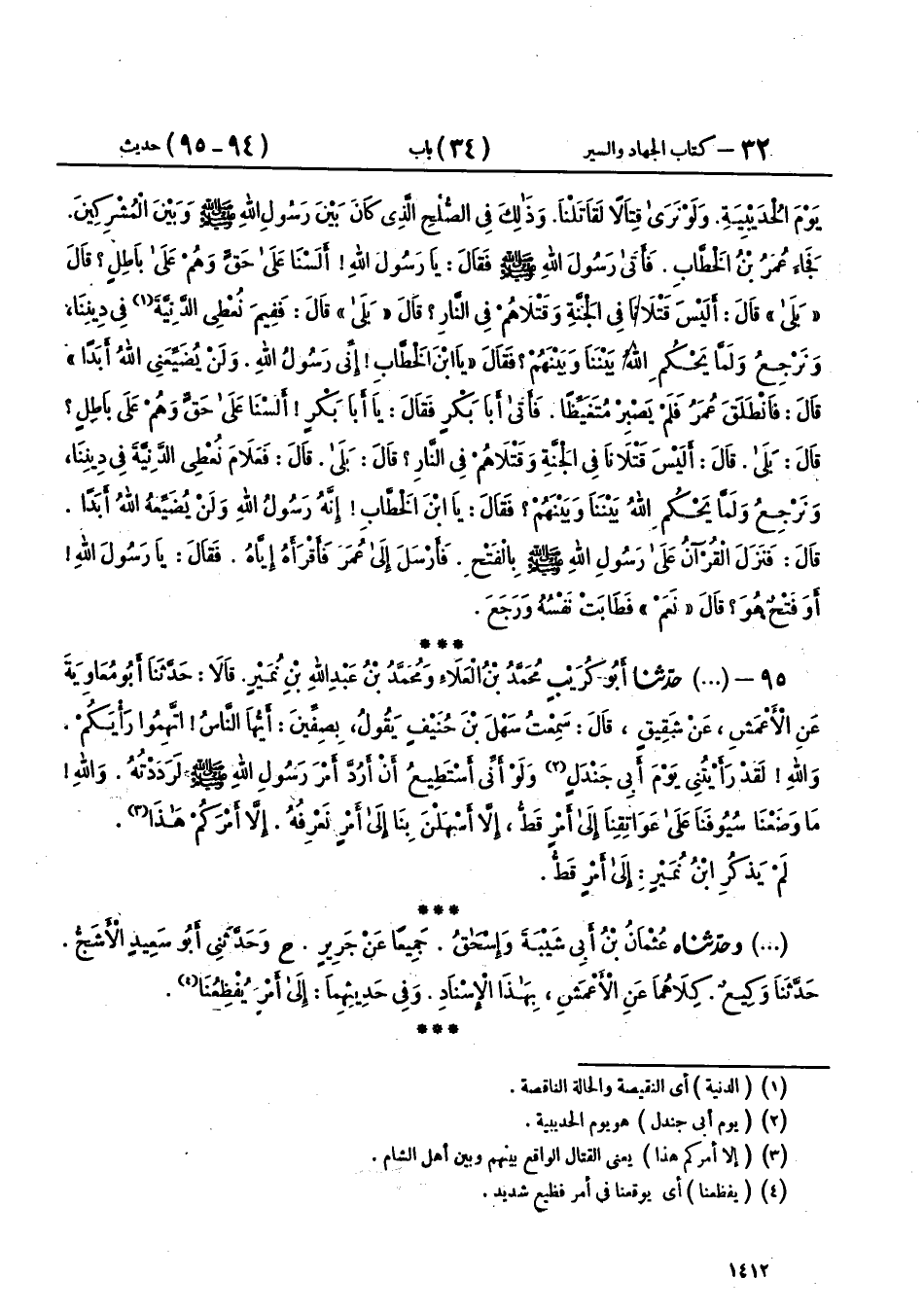 95 - (1785) حَدَّثَنَا أَبُو كُرَيْبٍ مُحَمَّدُ بْنُ الْعَلَاءِ، وَمُحَمَّدُ بْنُ عَبْدِ اللهِ بْنِ نُمَيْرٍ، قَالَا: حَدَّثَنَا أَبُو مُعَاوِيَةَ، عَنِ الْأَعْمَشِ، عَنْ شَقِيقٍ، قَالَ: سَمِعْتُ سَهْلَ بْنَ حُنَيْفٍ، يَقُولُ بِصِفِّينَ: «أَيُّهَا النَّاسُ، §اتَّهِمُوا رَأْيَكُمْ، وَاللهِ، لَقَدْ رَأَيْتُنِي يَوْمَ أَبِي جَنْدَلٍ، وَلَوْ أَنِّي أَسْتَطِيعُ أَنْ أَرُدَّ أَمْرَ رَسُولِ اللهِ صَلَّى اللهُ عَلَيْهِ وَسَلَّمَ لَرَدَدْتُهُ، وَاللهِ، مَا وَضَعْنَا سُيُوفَنَا عَلَى عَوَاتِقِنَا إِلَى أَمْرٍ قَطُّ، إِلَّا أَسْهَلْنَ بِنَا إِلَى أَمْرٍ نَعْرِفُهُ إِلَّا أَمْرَكُمْ هَذَا»، لَمْ يَذْكُرِ ابْنُ نُمَيْرٍ إِلَى أَمْرٍ قَطُّ،