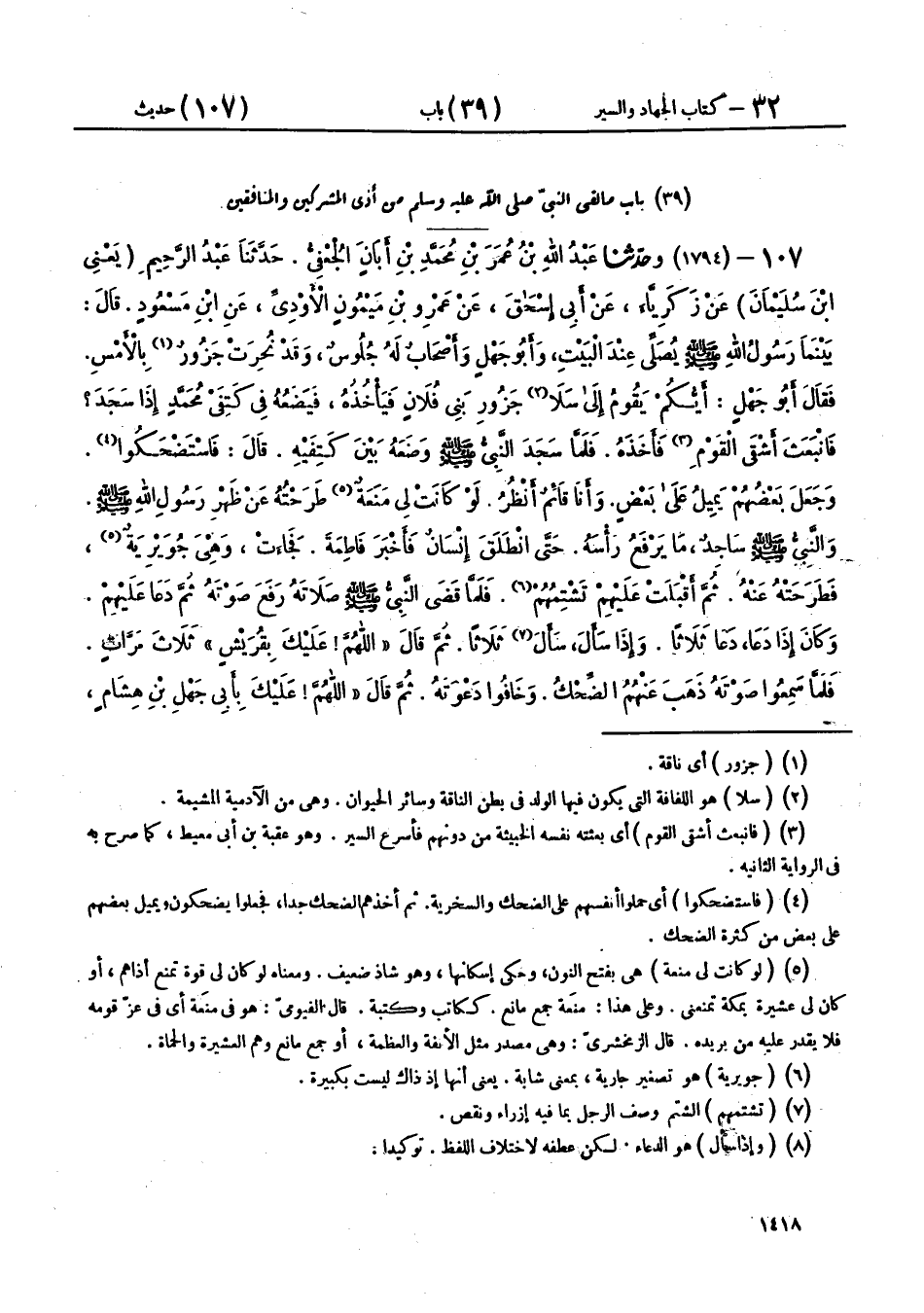 107 - (1794) وحَدَّثَنَا عَبْدُ اللهِ بْنُ عُمَرَ بْنِ مُحَمَّدِ بْنِ أَبَانَ الْجُعْفِيُّ، حَدَّثَنَا عَبْدُ الرَّحِيمِ يَعْنِي ابْنَ سُلَيْمَانَ، عَنْ زَكَرِيَّا، عَنْ أَبِي إِسْحَاقَ، عَنْ عَمْرِو بْنِ مَيْمُونٍ الْأَوْدِيِّ، عَنِ ابْنِ مَسْعُودٍ، قَالَ: بَيْنَمَا رَسُولُ اللهِ صَلَّى اللهُ عَلَيْهِ وَسَلَّمَ يُصَلِّي عِنْدَ الْبَيْتِ، وَأَبُو جَهْلٍ وَأَصْحَابٌ لَهُ جُلُوسٌ، وَقَدْ نُحِرَتْ جَزُورٌ بِالْأَمْسِ، فَقَالَ أَبُو جَهْلٍ: أَيُّكُمْ يَقُومُ إِلَى سَلَا جَزُورِ بَنِي فُلَانٍ، فَيَأْخُذُهُ فَيَضَعُهُ فِي كَتِفَيْ مُحَمَّدٍ إِذَا سَجَدَ؟ فَانْبَعَثَ أَشْقَى الْقَوْمِ فَأَخَذَهُ، فَلَمَّا سَجَدَ النَّبِيُّ صَلَّى اللهُ عَلَيْهِ وَسَلَّمَ وَضَعَهُ بَيْنَ كَتِفَيْهِ، قَالَ: فَاسْتَضْحَكُوا، وَجَعَلَ بَعْضُهُمْ يَمِيلُ عَلَى بَعْضٍ وَأَنَا قَائِمٌ أَنْظُرُ، لَوْ كَانَتْ لِي مَنَعَةٌ طَرَحْتُهُ عَنْ ظَهْرِ رَسُولِ اللهِ صَلَّى اللهُ عَلَيْهِ وَسَلَّمَ، وَالنَّبِيُّ صَلَّى اللهُ عَلَيْهِ وَسَلَّمَ سَاجِدٌ مَا يَرْفَعُ رَأْسَهُ حَتَّى انْطَلَقَ إِنْسَانٌ فَأَخْبَرَ فَاطِمَةَ، فَجَاءَتْ وَهِيَ جُوَيْرِيَةٌ، فَطَرَحَتْهُ عَنْهُ، ثُمَّ أَقْبَلَتْ عَلَيْهِمْ تَشْتِمُهُمْ، فَلَمَّا قَضَى النَّبِيُّ صَلَّى اللهُ عَلَيْهِ وَسَلَّمَ صَلَاتَهُ، رَفَعَ صَوْتَهُ، ثُمَّ دَعَا عَلَيْهِمْ، وَكَانَ إِذَا دَعَا دَعَا ثَلَاثًا، وَإِذَا سَأَلَ سَأَلَ ثَلَاثًا، ثُمَّ قَالَ: «§اللهُمَّ، عَلَيْكَ بِقُرَيْشٍ» ثَلَاثَ مَرَّاتٍ، فَلَمَّا سَمِعُوا صَوْتَهُ ذَهَبَ عَنْهُمُ الضِّحْكُ، وَخَافُوا دَعْوَتَهُ، ثُمَّ قَالَ: «اللهُمَّ، عَلَيْكَ بِأَبِي جَهْلِ بْنِ هِشَامٍ، وَعُتْبَةَ بْنِ رَبِيعَةَ، وَشَيْبَةَ بْنِ رَبِيعَةَ، وَالْوَلِيدِ بْنِ عُقْبَةَ، وَأُمَيَّةَ بْنِ خَلَفٍ، وَعُقْبَةَ بْنِ أَبِي مُعَيْطٍ» - وَذَكَرَ السَّابِعَ وَلَمْ أَحْفَظْهُ - فَوَالَّذِي بَعَثَ مُحَمَّدًا صَلَّى اللهُ عَلَيْهِ وَسَلَّمَ بِالْحَقِّ، لَقَدْ رَأَيْتُ الَّذِينَ سَمَّى صَرْعَى يَوْمَ بَدْرٍ، ثُمَّ سُحِبُوا إِلَى الْقَلِيبِ - قَلِيبِ بَدْرٍ - قَالَ أَبُو إِسْحَاقَ: «الْوَلِيدُ بْنُ عُقْبَةَ غَلَطٌ فِي هَذَا الْحَدِيثِ»