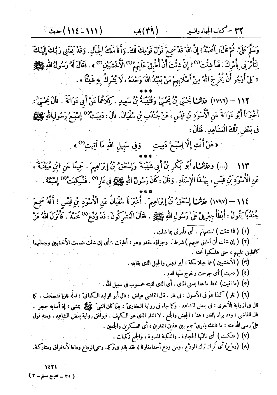 113 - (1796) وَحَدَّثَنَاهُ أَبُو بَكْرِ بْنُ أَبِي شَيْبَةَ، وَإِسْحَاقُ بْنُ إِبْرَاهِيمَ، جَمِيعًا عَنِ ابْنِ عُيَيْنَةَ، عَنِ الْأَسْوَدِ بْنِ قَيْسٍ، بِهَذَا الْإِسْنَادِ، وَقَالَ: كَانَ رَسُولُ اللهِ صَلَّى اللهُ عَلَيْهِ وَسَلَّمَ فِي غَارٍ فَنُكِبَتْ إِصْبَعُهُ
