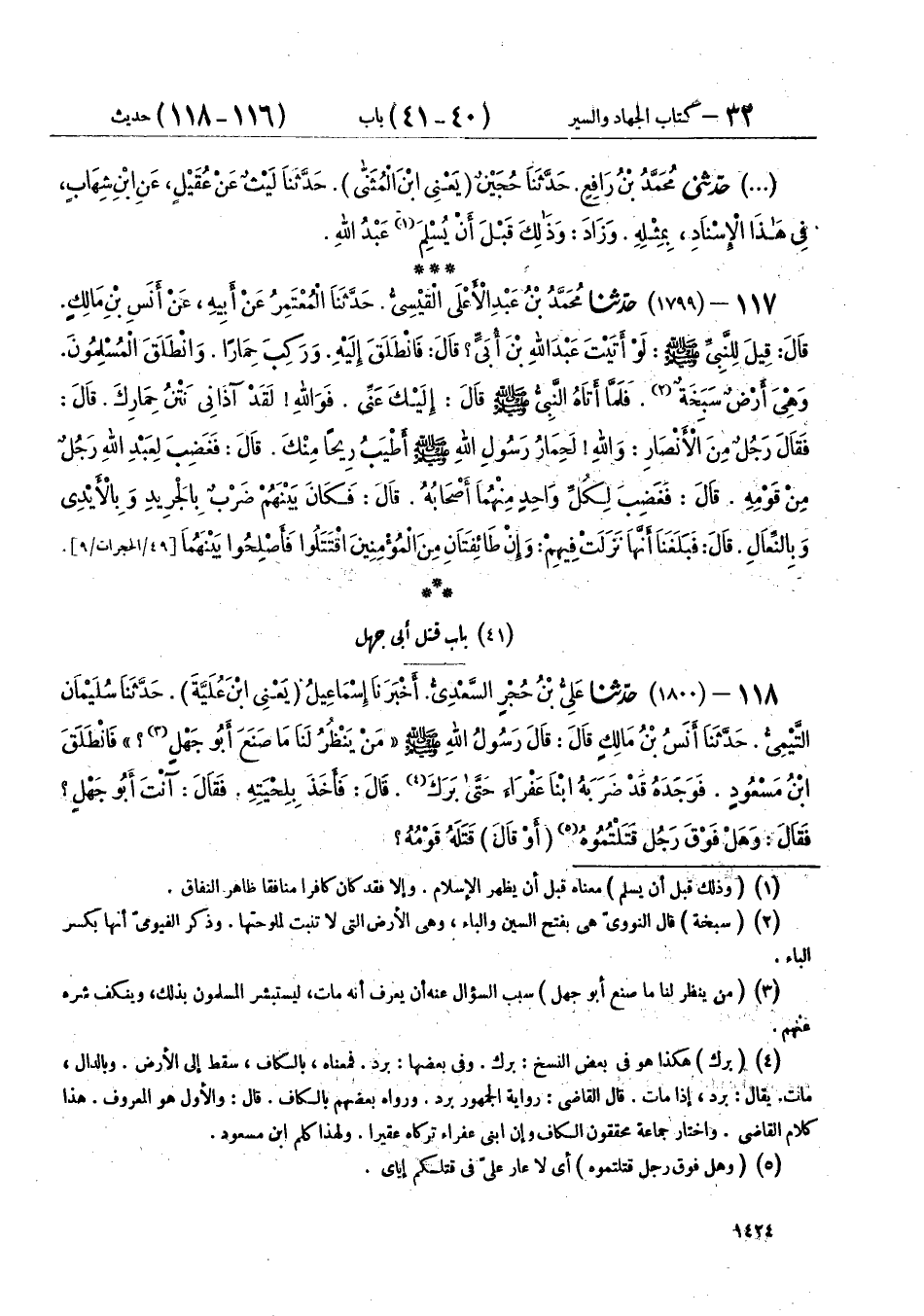 118 - (1800) حَدَّثَنَا عَلِيُّ بْنُ حُجْرٍ السَّعْدِيُّ، أَخْبَرَنَا إِسْمَاعِيلُ يَعْنِي ابْنَ عُلَيَّةَ، حَدَّثَنَا سُلَيْمَانُ التَّيْمِيُّ، حَدَّثَنَا أَنَسُ بْنُ مَالِكٍ، قَالَ: قَالَ رَسُولُ اللهِ صَلَّى اللهُ عَلَيْهِ وَسَلَّمَ: «§مَنْ يَنْظُرُ لَنَا مَا صَنَعَ أَبُو جَهْلٍ؟» فَانْطَلَقَ ابْنُ مَسْعُودٍ، فَوَجَدَهُ قَدْ ضَرَبَهُ ابْنَا عَفْرَاءَ، حَتَّى بَرَكَ، قَالَ: فَأَخَذَ بِلِحْيَتِهِ، فَقَالَ: آنْتَ أَبُو جَهْلٍ؟ فَقَالَ: وَهَلْ فَوْقَ رَجُلٍ قَتَلْتُمُوهُ - أَو قَالَ: قَتَلَهُ قَوْمُهُ -، قَالَ: وَقَالَ أَبُو مِجْلَزٍ: قَالَ أَبُو جَهْلٍ: فَلَوْ غَيْرُ أَكَّارٍ قَتَلَنِي -[1425]-، حَدَّثَنَا حَامِدُ بْنُ عُمَرَ الْبَكْرَاوِيُّ، حَدَّثَنَا مُعْتَمِرٌ، قَالَ: سَمِعْتُ أَبِي، يَقُولُ: حَدَّثَنَا أَنَسٌ، قَالَ: قَالَ رَسُولُ اللهِ صَلَّى اللهُ عَلَيْهِ وَسَلَّمَ: «مَنْ يَعْلَمُ لِي مَا فَعَلَ أَبُو جَهْلٍ» بِمِثْلِ حَدِيثِ ابْنِ عُلَيَّةَ، وَقَوْلِ أَبِي مِجْلَزٍ كَمَا ذَكَرَهُ إِسْمَاعِيلُ