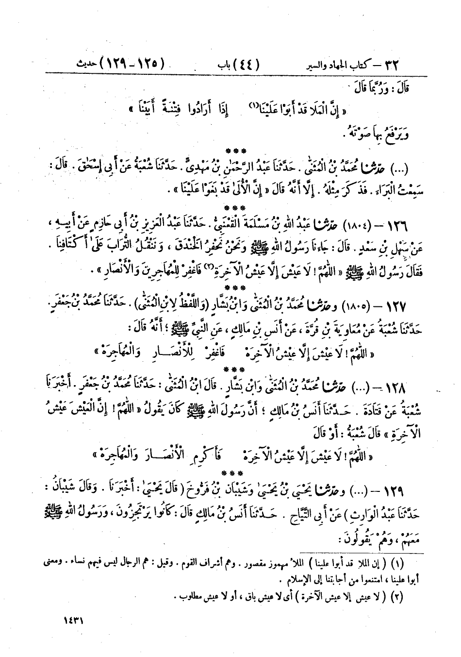 127 - (1805) وحَدَّثَنَا مُحَمَّدُ بْنُ الْمُثَنَّى، وَابْنُ بَشَّارٍ، وَاللَّفْظُ لِابْنِ الْمُثَنَّى، حَدَّثَنَا مُحَمَّدُ بْنُ جَعْفَرٍ، حَدَّثَنَا شُعْبَةُ، عَنْ مُعَاوِيَةَ بْنِ قُرَّةَ، عَنْ أَنَسِ بْنِ مَالِكٍ، عَنِ النَّبِيِّ صَلَّى اللهُ عَلَيْهِ وَسَلَّمَ أَنَّهُ قَالَ: «§اللهُمَّ لَا عَيْشَ إِلَّا عَيْشُ الْآخِرَهْ، فَاغْفِرْ لِلْأَنْصَارِ وَالْمُهَاجِرَهْ»