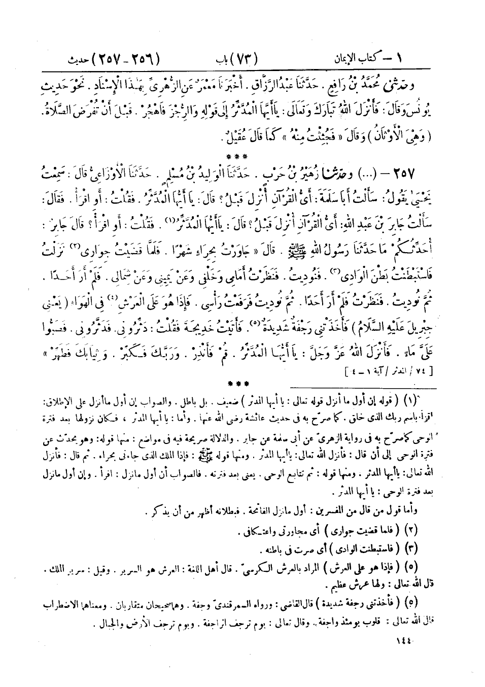 257 - (161) وَحَدَّثَنَا زُهَيْرُ بْنُ حَرْبٍ، حَدَّثَنَا الْوَلِيدُ بْنُ مُسْلِمٍ، حَدَّثَنَا الْأَوْزَاعِيُّ، قَالَ: سَمِعْتُ يَحْيَى، يَقُولُ: سَأَلْتُ أَبَا سَلَمَةَ أَيُّ الْقُرْآنِ أُنْزِلَ قَبْلُ؟ قَالَ: يَا أَيُّهَا الْمُدَّثِّرُ، فَقُلْتُ: أَوِ اقْرَأْ؟ فَقَالَ: سَأَلْتُ جَابِرَ بْنَ عَبْدِ اللهِ أَيُّ الْقُرْآنِ أُنْزِلَ قَبْلُ؟ قَالَ: يَا أَيُّهَا الْمُدَّثِّرُ، فَقُلْتُ: أَوْ اقْرَأْ؟ قَالَ جَابِرٌ: أُحَدِّثُكُمْ مَا حَدَّثَنَا رَسُولُ اللهِ صَلَّى اللهُ عَلَيْهِ وَسَلَّمَ، قَالَ: " جَاوَرْتُ بِحِرَاءٍ شَهْرًا، فَلَمَّا قَضَيْتُ جِوَارِي نَزَلْتُ فَاسْتَبْطَنْتُ بَطْنَ الْوَادِي، فَنُودِيتُ فَنَظَرْتُ أَمَامِي وَخَلْفِي، وَعَنْ يَمِينِي، وَعَنْ شِمَالِي، فَلَمْ أَرَ أَحَدًا، ثُمَّ نُودِيتُ فَنَظَرْتُ فَلَمْ أَرَ أَحَدًا، ثُمَّ نُودِيتُ فَرَفَعْتُ رَأْسِي، §فَإِذَا هُوَ عَلَى الْعَرْشِ فِي الْهَوَاءِ - يَعْنِي جِبْرِيلَ عَلَيْهِ السَّلَامُ - فَأَخَذَتْنِي رَجْفَةٌ شَدِيدَةٌ، فَأَتَيْتُ خَدِيجَةَ، فَقُلْتُ: دَثِّرُونِي، فَدَثَّرُونِي، فَصَبُّوا عَلَيَّ مَاءً، فَأَنْزَلَ اللهُ عَزَّ وَجَلَّ: {يَا أَيُّهَا الْمُدَّثِّرُ قُمْ فَأَنْذِرْ وَرَبَّكَ فَكَبِّرْ وَثِيَابَكَ فَطَهِّرْ} [المدثر: 2] "،