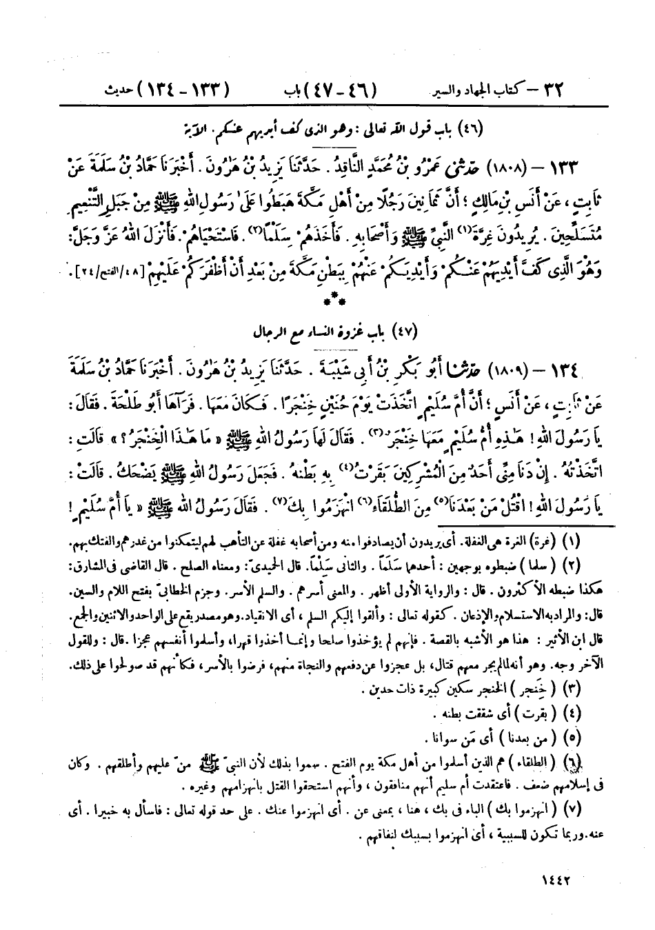134 - (1809) حَدَّثَنَا أَبُو بَكْرِ بْنُ أَبِي شَيْبَةَ، حَدَّثَنَا يَزِيدُ بْنُ هَارُونَ، أَخْبَرَنَا حَمَّادُ بْنُ سَلَمَةَ، عَنْ ثَابِتٍ، عَنْ أَنَسٍ، أَنَّ أُمَّ سُلَيْمٍ اتَّخَذَتْ يَوْمَ حُنَيْنٍ خِنْجَرًا، فَكَانَ مَعَهَا، فَرَآهَا أَبُو طَلْحَةَ، فَقَالَ: يَا رَسُولَ اللهِ، هَذِهِ أُمُّ سُلَيْمٍ مَعَهَا خِنْجَرٌ، فَقَالَ لَهَا رَسُولُ اللهِ صَلَّى اللهُ عَلَيْهِ وَسَلَّمَ: «§مَا هَذَا الْخِنْجَرُ؟» قَالَتْ: اتَّخَذْتُهُ إِنْ: دَنَا مِنِّي أَحَدٌ مِنَ الْمُشْرِكِينَ، بَقَرْتُ بِهِ بَطْنَهُ، فَجَعَلَ رَسُولُ اللهِ صَلَّى اللهُ عَلَيْهِ وَسَلَّمَ يَضْحَكُ، قَالَتْ: يَا رَسُولَ اللهِ، اقْتُلْ مَنْ بَعْدَنَا مِنَ الطُّلَقَاءِ انْهَزَمُوا بِكَ؟ فَقَالَ رَسُولُ اللهِ صَلَّى اللهُ عَلَيْهِ وَسَلَّمَ: «يَا أُمَّ سُلَيْمٍ، إِنَّ اللهَ قَدْ كَفَى وَأَحْسَنَ»،