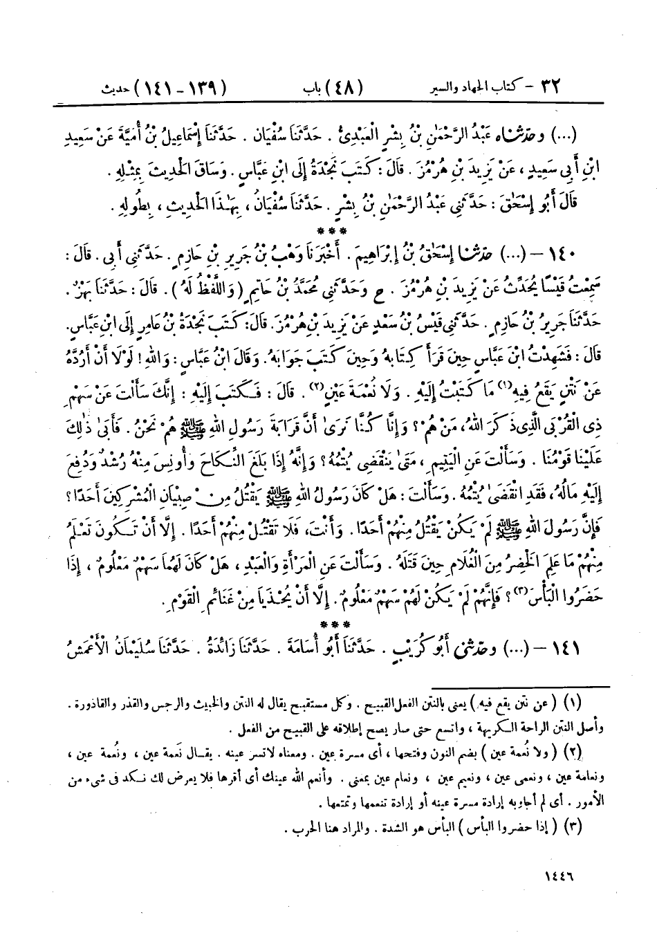 140 - (1812) حَدَّثَنَا إِسْحَاقُ بْنُ إِبْرَاهِيمَ، أَخْبَرَنَا وَهْبُ بْنُ جَرِيرِ بْنِ حَازِمٍ، حَدَّثَنِي أَبِي، قَالَ: سَمِعْتُ قَيْسًا، يُحَدِّثُ عَنْ يَزِيدَ بْنِ هُرْمُزَ، ح وحَدَّثَنِي مُحَمَّدُ بْنُ حَاتِمٍ، وَاللَّفْظُ لَهُ، قَالَ: حَدَّثَنَا بَهْزٌ، حَدَّثَنَا جَرِيرُ بْنُ حَازِمٍ، حَدَّثَنِي قَيْسُ بْنُ سَعْدٍ، عَنْ يَزِيدَ بْنِ هُرْمُزَ، قَالَ: كَتَبَ نَجْدَةُ بْنُ عَامِرٍ إِلَى ابْنِ عَبَّاسٍ، قَالَ: فَشَهِدْتُ ابْنَ عَبَّاسٍ حِينَ قَرَأَ كِتَابَهُ، وَحِينَ كَتَبَ جَوَابَهُ، وَقَالَ ابْنُ عَبَّاسٍ: وَاللهِ لَوْلَا أَنْ أَرُدَّهُ عَنْ نَتْنٍ يَقَعُ فِيهِ مَا كَتَبْتُ إِلَيْهِ، وَلَا نُعْمَةَ عَيْنٍ، قَالَ: فَكَتَبَ إِلَيْهِ: «إِنَّكَ §سَأَلْتَ عَنْ سَهْمِ ذِي الْقُرْبَى الَّذِي ذَكَرَ اللهُ مَنْ هُمْ؟ وَإِنَّا كُنَّا نَرَى أَنَّ قَرَابَةَ رَسُولِ اللهِ صَلَّى اللهُ عَلَيْهِ وَسَلَّمَ هُمْ نَحْنُ، فَأَبَى ذَلِكَ عَلَيْنَا قَوْمُنَا، وَسَأَلْتَ عَنِ الْيَتِيمِ مَتَى يَنْقَضِي يُتْمُهُ؟ وَإِنَّهُ إِذَا بَلَغَ النِّكَاحَ، وَأُونِسَ مِنْهُ رُشْدٌ، وَدُفِعَ إِلَيْهِ مَالُهُ، فَقَدِ انْقَضَى يُتْمُهُ، وَسَأَلْتَ هَلْ كَانَ رَسُولُ اللهِ صَلَّى اللهُ عَلَيْهِ وَسَلَّمَ يَقْتُلُ مِنْ صِبْيَانِ الْمُشْرِكِينَ أَحَدًا؟ فَإِنَّ رَسُولَ اللهِ صَلَّى اللهُ عَلَيْهِ وَسَلَّمَ لَمْ يَكُنْ يَقْتُلُ مِنْهُمْ أَحَدًا، وَأَنْتَ فَلَا تَقْتُلْ مِنْهُمْ أَحَدًا، إِلَّا أَنْ تَكُونَ تَعْلَمُ مِنْهُمْ مَا عَلِمَ الْخَضِرُ مِنَ الْغُلَامِ حِينَ قَتَلَهُ، وَسَأَلْتَ عَنِ الْمَرْأَةِ وَالْعَبْدِ هَلْ كَانَ لَهُمَا سَهْمٌ مَعْلُومٌ إِذَا حَضَرُوا الْبَأْسَ؟ فَإِنَّهُمْ لَمْ يَكُنْ لَهُمْ سَهْمٌ مَعْلُومٌ، إِلَّا أَنْ يُحْذَيَا مِنْ غَنَائِمِ الْقَوْمِ»