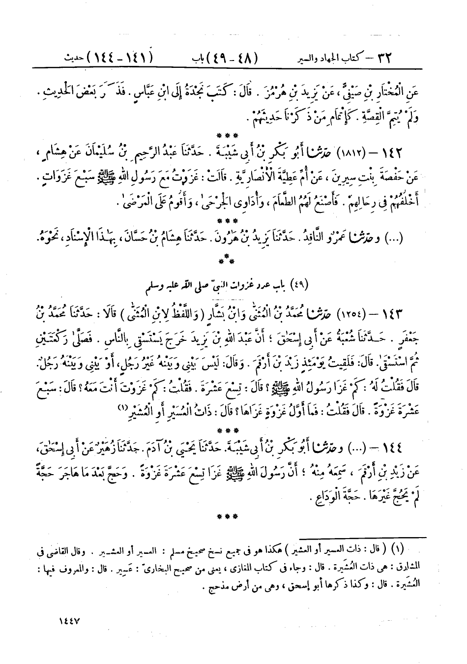 144 - (1254) وحَدَّثَنَا أَبُو بَكْرِ بْنُ أَبِي شَيْبَةَ، حَدَّثَنَا يَحْيَى بْنُ آدَمَ، حَدَّثَنَا زُهَيْرٌ، عَنْ أَبِي إِسْحَاقَ، عَنْ زَيْدِ بْنِ أَرْقَمَ، سَمِعَهُ مِنْهُ، «أَنَّ رَسُولَ اللهِ صَلَّى اللهُ عَلَيْهِ وَسَلَّمَ §غَزَا تِسْعَ عَشْرَةَ غَزْوَةً، وَحَجَّ بَعْدَ مَا هَاجَرَ حَجَّةً لَمْ يَحُجَّ غَيْرَهَا، حَجَّةَ الْوَدَاعِ»