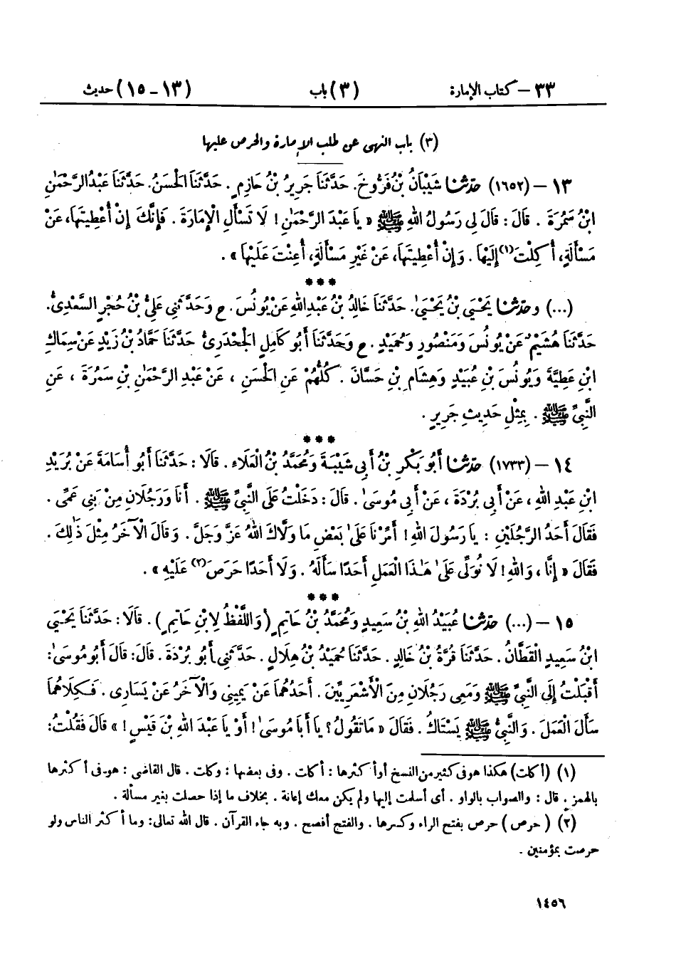 14 - (1733) حَدَّثَنَا أَبُو بَكْرِ بْنُ أَبِي شَيْبَةَ، وَمُحَمَّدُ بْنُ الْعَلَاءِ، قَالَا: حَدَّثَنَا أَبُو أُسَامَةَ، عَنْ بُرَيْدِ بْنِ عَبْدِ اللهِ، عَنْ أَبِي بُرْدَةَ، عَنْ أَبِي مُوسَى، قَالَ: دَخَلْتُ عَلَى النَّبِيِّ صَلَّى اللهُ عَلَيْهِ وَسَلَّمَ أَنَا وَرَجُلَانِ مِنْ بَنِي عَمِّي، فَقَالَ أَحَدُ الرَّجُلَيْنِ: يَا رَسُولَ اللهِ، أَمِّرْنَا عَلَى بَعْضِ مَا وَلَّاكَ اللهُ عَزَّ وَجَلَّ، وَقَالَ الْآخَرُ مِثْلَ ذَلِكَ، فَقَالَ: «إِنَّا وَاللهِ §لَا نُوَلِّي عَلَى هَذَا الْعَمَلِ أَحَدًا سَأَلَهُ، وَلَا أَحَدًا حَرَصَ عَلَيْهِ»