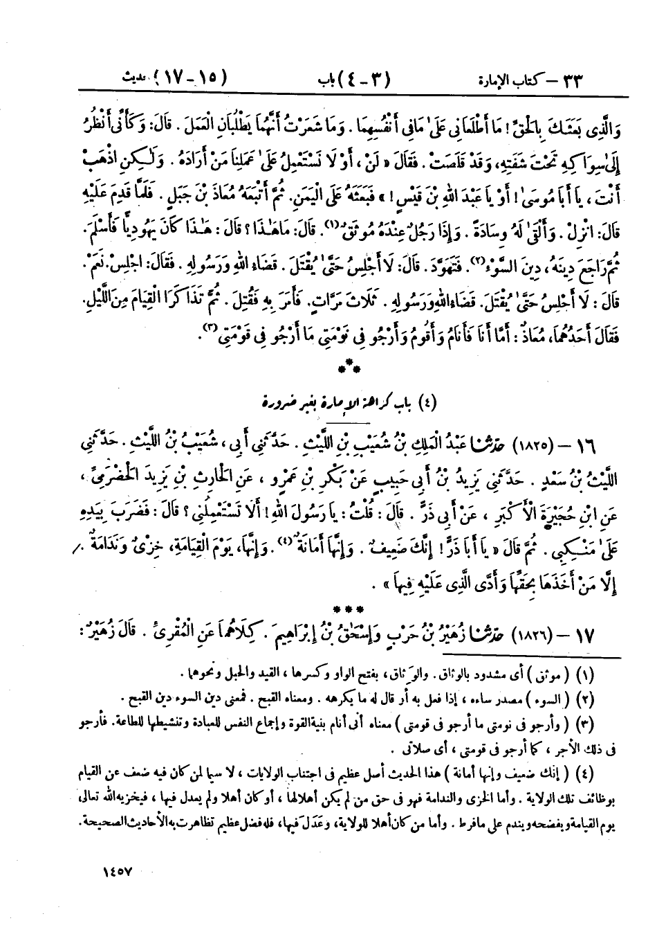 17 - (1826) حَدَّثَنَا زُهَيْرُ بْنُ حَرْبٍ، وَإِسْحَاقُ بْنُ إِبْرَاهِيمَ، كِلَاهُمَا عَنِ الْمُقْرِئِ، قَالَ زُهَيْرٌ: حَدَّثَنَا عَبْدُ اللهِ بْنُ يَزِيدَ، حَدَّثَنَا سَعِيدُ بْنُ أَبِي أَيُّوبَ، عَنْ عُبَيْدِ اللهِ بْنِ أَبِي جَعْفَرٍ الْقُرَشِيِّ، عَنْ سَالِمِ بْنِ أَبِي سَالِمٍ الْجَيْشَانِيِّ، عَنْ أَبِيهِ، عَنْ أَبِي ذَرٍّ، أَنَّ رَسُولَ اللهِ صَلَّى اللهُ عَلَيْهِ وَسَلَّمَ، قَالَ: «يَا أَبَا ذَرٍّ، §إِنِّي أَرَاكَ ضَعِيفًا، وَإِنِّي أُحِبُّ لَكَ مَا أُحِبُّ لِنَفْسِي، لَا تَأَمَّرَنَّ عَلَى اثْنَيْنِ، وَلَا تَوَلَّيَنَّ مَالَ يَتِيمٍ»