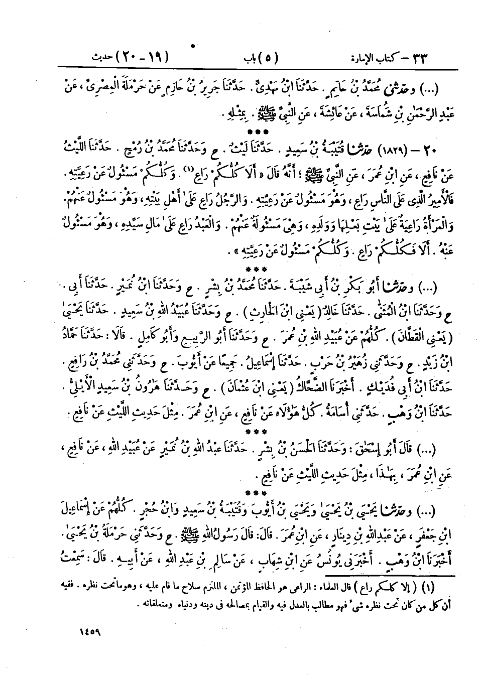 20 - (1829) حَدَّثَنَا قُتَيْبَةُ بْنُ سَعِيدٍ، حَدَّثَنَا لَيْثٌ، ح وحَدَّثَنَا مُحَمَّدُ بْنُ رُمْحٍ، حَدَّثَنَا اللَّيْثُ، عَنْ نَافِعٍ، عَنِ ابْنِ عُمَرَ، عَنِ النَّبِيِّ صَلَّى اللهُ عَلَيْهِ وَسَلَّمَ أَنَّهُ قَالَ: «§أَلَا كُلُّكُمْ رَاعٍ، وَكُلُّكُمْ مَسْئُولٌ عَنْ رَعِيَّتِهِ، فَالْأَمِيرُ الَّذِي عَلَى النَّاسِ رَاعٍ، وَهُوَ مَسْئُولٌ عَنْ رَعِيَّتِهِ، وَالرَّجُلُ رَاعٍ عَلَى أَهْلِ بَيْتِهِ، وَهُوَ مَسْئُولٌ عَنْهُمْ، وَالْمَرْأَةُ رَاعِيَةٌ عَلَى بَيْتِ بَعْلِهَا وَوَلَدِهِ، وَهِيَ مَسْئُولَةٌ عَنْهُمْ، وَالْعَبْدُ رَاعٍ عَلَى مَالِ سَيِّدِهِ وَهُوَ مَسْئُولٌ عَنْهُ، أَلَا فَكُلُّكُمْ رَاعٍ، وَكُلُّكُمْ مَسْئُولٌ عَنْ رَعِيَّتِهِ»،