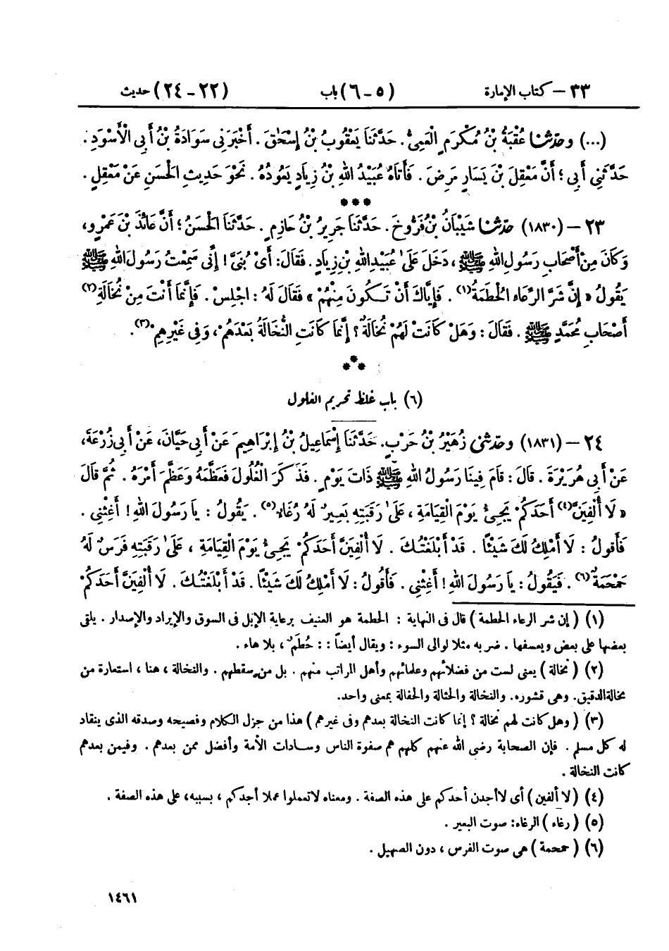 23 - (1830) حَدَّثَنَا شَيْبَانُ بْنُ فَرُّوخَ، حَدَّثَنَا جَرِيرُ بْنُ حَازِمٍ، حَدَّثَنَا الْحَسَنُ، أَنَّ عَائِذَ بْنَ عَمْرٍو، وَكَانَ مِنْ أَصْحَابِ رَسُولِ اللهِ صَلَّى اللهُ عَلَيْهِ وَسَلَّمَ دَخَلَ عَلَى عُبَيْدِ اللهِ بْنِ زِيَادٍ، فَقَالَ: أَيْ بُنَيَّ، إِنِّي سَمِعْتُ رَسُولَ اللهِ صَلَّى اللهُ عَلَيْهِ وَسَلَّمَ يَقُولُ: «إِنَّ §شَرَّ الرِّعَاءِ الْحُطَمَةُ، فَإِيَّاكَ أَنْ تَكُونَ مِنْهُمْ»، فَقَالَ لَهُ: اجْلِسْ فَإِنَّمَا أَنْتَ مِنْ نُخَالَةِ أَصْحَابِ مُحَمَّدٍ صَلَّى اللهُ عَلَيْهِ وَسَلَّمَ، فَقَالَ: «وَهَلْ كَانَتْ لَهُمْ نُخَالَةٌ؟ إِنَّمَا كَانَتِ النُّخَالَةُ بَعْدَهُمْ، وَفِي غَيْرِهِمْ»
