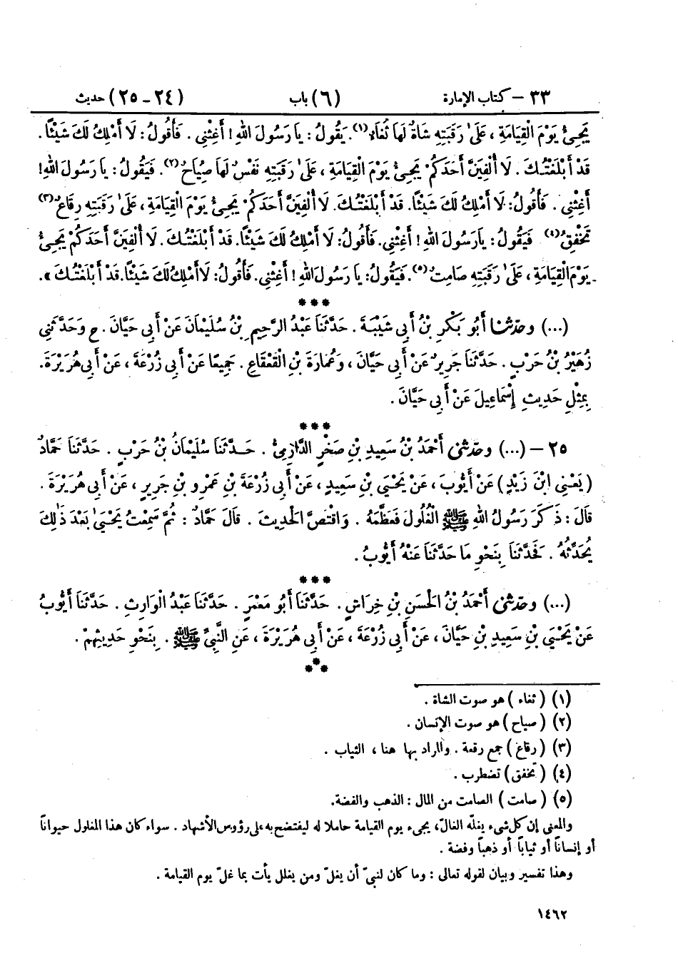 25 - (1831) وحَدَّثَنِي أَحْمَدُ بْنُ سَعِيدِ بْنِ صَخْرٍ الدَّارِمِيُّ، حَدَّثَنَا سُلَيْمَانُ بْنُ حَرْبٍ، حَدَّثَنَا حَمَّادٌ يَعْنِي ابْنَ زَيْدٍ، عَنْ أَيُّوبَ، عَنْ يَحْيَى بْنِ سَعِيدٍ، عَنْ أَبِي زُرْعَةَ بْنِ عَمْرِو بْنِ جَرِيرٍ، عَنْ أَبِي هُرَيْرَةَ، قَالَ: ذَكَرَ رَسُولُ اللهِ صَلَّى اللهُ عَلَيْهِ وَسَلَّمَ الْغُلُولَ، فَعَظَّمَهُ، وَاقْتَصَّ الْحَدِيثَ، قَالَ حَمَّادٌ: ثُمَّ سَمِعْتُ يَحْيَى بَعْدَ ذَلِكَ يُحَدِّثُهُ، فَحَدَّثَنَا بِنَحْوِ مَا حَدَّثَنَا عَنْهُ أَيُّوبُ،