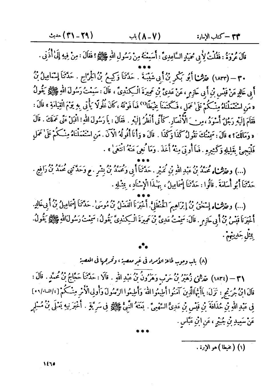 30 - (1833) حَدَّثَنَا أَبُو بَكْرِ بْنُ أَبِي شَيْبَةَ، حَدَّثَنَا وَكِيعُ بْنُ الْجَرَّاحِ، حَدَّثَنَا إِسْمَاعِيلُ بْنُ أَبِي خَالِدٍ، عَنْ قَيْسِ بْنِ أَبِي حَازِمٍ، عَنْ عَدِيِّ بْنِ عَمِيرَةَ الْكِنْدِيِّ، قَالَ: سَمِعْتُ رَسُولَ اللهِ صَلَّى اللهُ عَلَيْهِ وَسَلَّمَ يَقُولُ: «§مَنِ اسْتَعْمَلْنَاهُ مِنْكُمْ عَلَى عَمَلٍ، فَكَتَمَنَا مِخْيَطًا، فَمَا فَوْقَهُ كَانَ غُلُولًا يَأْتِي بِهِ يَوْمَ الْقِيَامَةِ»، قَالَ: فَقَامَ إِلَيْهِ رَجُلٌ أَسْوَدُ مِنَ الْأَنْصَارِ كَأَنِّي أَنْظُرُ إِلَيْهِ، فَقَالَ: يَا رَسُولَ اللهِ، اقْبَلْ عَنِّي عَمَلَكَ، قَالَ: «وَمَا لَكَ؟» قَالَ: سَمِعْتُكَ تَقُولُ: كَذَا وَكَذَا، قَالَ: «وَأَنَا أَقُولُهُ الْآنَ، مَنِ اسْتَعْمَلْنَاهُ مِنْكُمْ عَلَى عَمَلٍ، فَلْيَجِئْ بِقَلِيلِهِ وَكَثِيرِهِ، فَمَا أُوتِيَ مِنْهُ أَخَذَ، وَمَا نُهِيَ عَنْهُ انْتَهَى»،