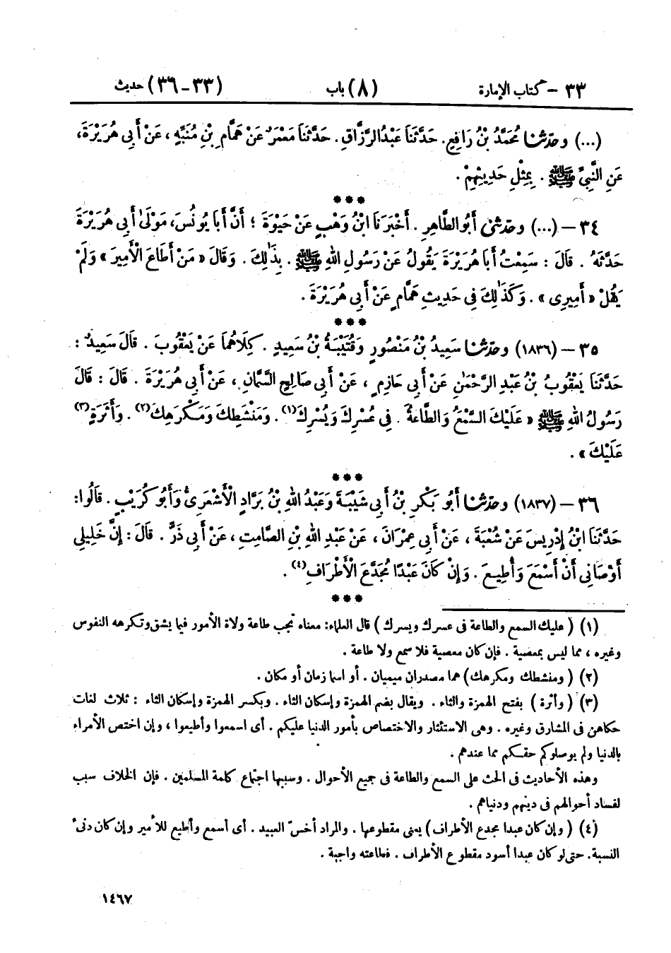 34 - (1835) وحَدَّثَنِي أَبُو الطَّاهِرِ، أَخْبَرَنَا ابْنُ وَهْبٍ، عَنْ حَيْوَةَ، أَنَّ أَبَا يُونُسَ مَوْلَى أَبِي هُرَيْرَةَ، حَدَّثَهُ، قَالَ: سَمِعْتُ أَبَا هُرَيْرَةَ، يَقُولُ: عَنْ رَسُولِ اللهِ صَلَّى اللهُ عَلَيْهِ وَسَلَّمَ بِذَلِكَ، وَقَالَ: «مَنْ أَطَاعَ الْأَمِيرَ»، وَلَمْ يَقُلْ: «أَمِيرِي»، وَكَذَلِكَ فِي حَدِيثِ هَمَّامٍ، عَنْ أَبِي هُرَيْرَةَ