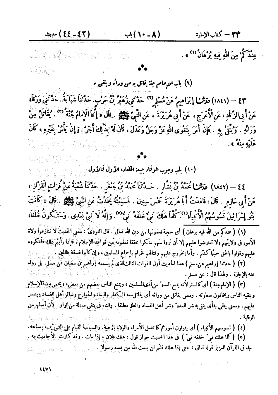 44 - (1842) حَدَّثَنَا مُحَمَّدُ بْنُ بَشَّارٍ، حَدَّثَنَا مُحَمَّدُ بْنُ جَعْفَرٍ، حَدَّثَنَا شُعْبَةُ، عَنْ فُرَاتٍ الْقَزَّازِ، عَنْ أَبِي حَازِمٍ، قَالَ: قَاعَدْتُ أَبَا هُرَيْرَةَ خَمْسَ سِنِينَ فَسَمِعْتُهُ يُحَدِّثُ، عَنِ النَّبِيِّ صَلَّى اللهُ عَلَيْهِ وَسَلَّمَ، قَالَ: «§كَانَتْ بَنُو إِسْرَائِيلَ تَسُوسُهُمُ الْأَنْبِيَاءُ، كُلَّمَا هَلَكَ نَبِيٌّ خَلَفَهُ نَبِيٌّ، وَإِنَّهُ لَا نَبِيَّ بَعْدِي، وَسَتَكُونُ خُلَفَاءُ فَتَكْثُرُ»، قَالُوا: فَمَا تَأْمُرُنَا؟ قَالَ: «فُوا بِبَيْعَةِ الْأَوَّلِ، فَالْأَوَّلِ، وَأَعْطُوهُمْ حَقَّهُمْ، فَإِنَّ اللهَ سَائِلُهُمْ عَمَّا اسْتَرْعَاهُمْ»،