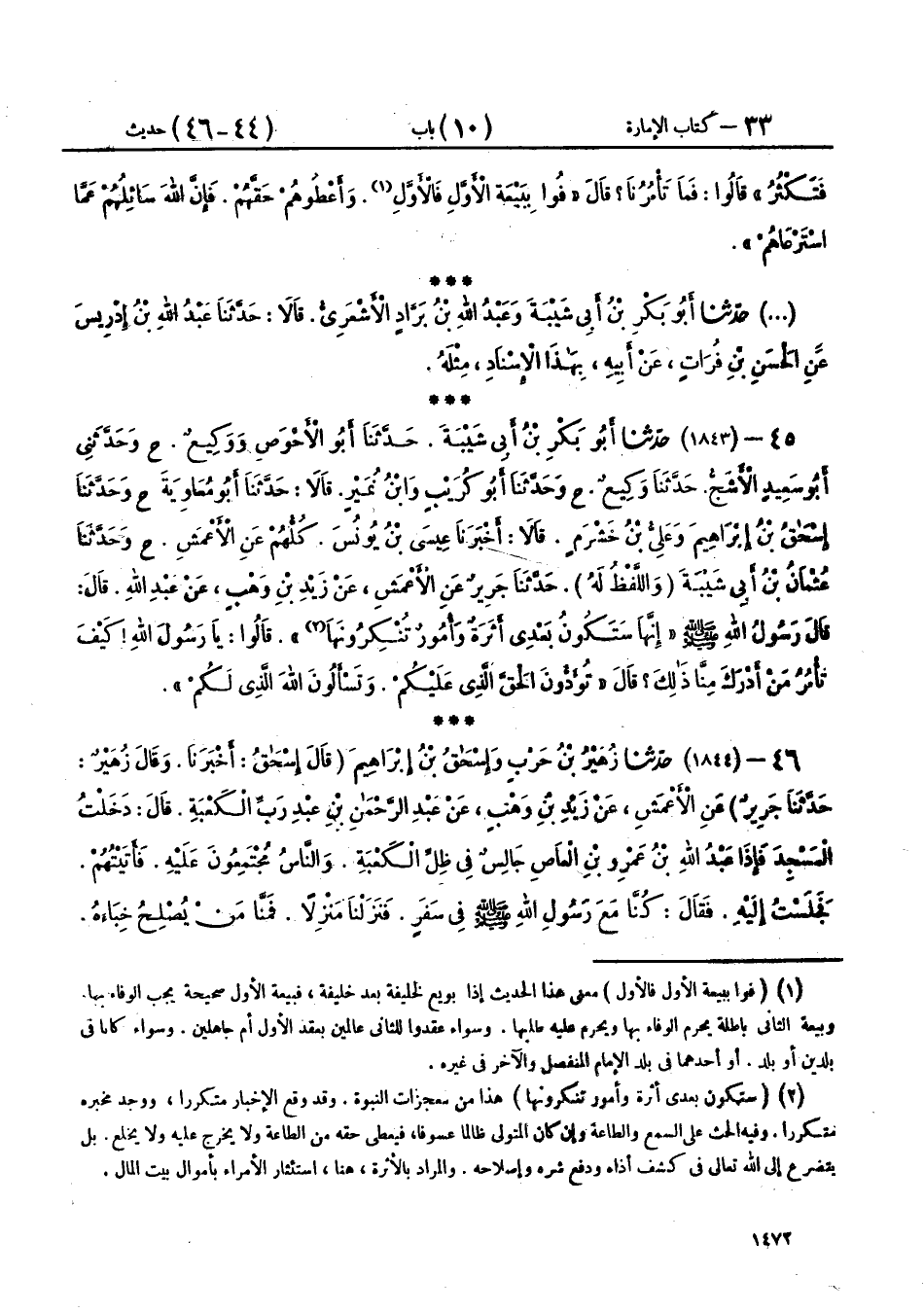45 - (1843) حَدَّثَنَا أَبُو بَكْرِ بْنُ أَبِي شَيْبَةَ، حَدَّثَنَا أَبُو الْأَحْوَصِ، وَوَكِيعٌ، ح وحَدَّثَنِي أَبُو سَعِيدٍ الْأَشَجُّ، حَدَّثَنَا وَكِيعٌ، ح وحَدَّثَنَا أَبُو كُرَيْبٍ، وَابْنُ نُمَيْرٍ، قَالَا: حَدَّثَنَا أَبُو مُعَاوِيَةَ، ح وحَدَّثَنَا إِسْحَاقُ بْنُ إِبْرَاهِيمَ، وَعَلِيُّ بْنُ خَشْرَمٍ، قَالَا: أَخْبَرَنَا عِيسَى بْنُ يُونُسَ، كُلُّهُمْ عَنِ الْأَعْمَشِ، ح وحَدَّثَنَا عُثْمَانُ بْنُ أَبِي شَيْبَةَ، وَاللَّفْظُ لَهُ، حَدَّثَنَا جَرِيرٌ، عَنِ الْأَعْمَشِ، عَنْ زَيْدِ بْنِ وَهْبٍ، عَنْ عَبْدِ اللهِ، قَالَ: قَالَ رَسُولُ اللهِ صَلَّى اللهُ عَلَيْهِ وَسَلَّمَ: «إِنَّهَا §سَتَكُونُ بَعْدِي أَثَرَةٌ وَأُمُورٌ تُنْكِرُونَهَا»، قَالُوا: يَا رَسُولَ اللهِ، كَيْفَ تَأْمُرُ مَنْ أَدْرَكَ مِنَّا ذَلِكَ؟ قَالَ: «تُؤَدُّونَ الْحَقَّ الَّذِي عَلَيْكُمْ، وَتَسْأَلُونَ اللهَ الَّذِي لَكُمْ»