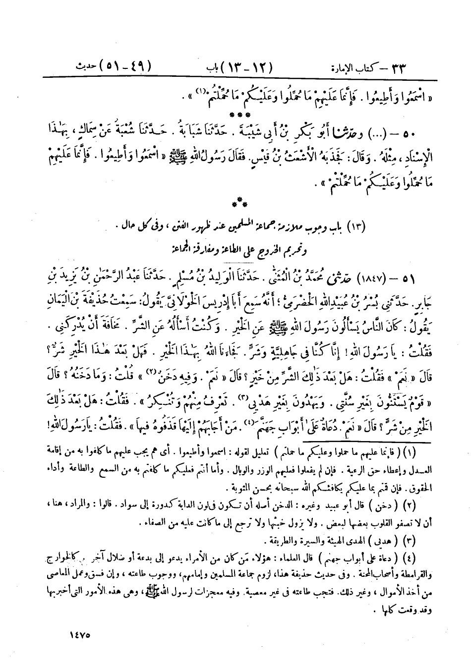 51 - (1847) حَدَّثَنِي مُحَمَّدُ بْنُ الْمُثَنَّى، حَدَّثَنَا الْوَلِيدُ بْنُ مُسْلِمٍ، حَدَّثَنَا عَبْدُ الرَّحْمَنِ بْنُ يَزِيدَ بْنِ جَابِرٍ، حَدَّثَنِي بُسْرُ بْنُ عُبَيْدِ اللهِ الْحَضْرَمِيُّ، أَنَّهُ سَمِعَ أَبَا إِدْرِيسَ الْخَوْلَانِيَّ، يَقُولُ: سَمِعْتُ حُذَيْفَةَ بْنَ الْيَمَانِ، يَقُولُ: كَانَ النَّاسُ يَسْأَلُونَ رَسُولَ اللهِ صَلَّى اللهُ عَلَيْهِ وَسَلَّمَ عَنِ الْخَيْرِ، وَكُنْتُ أَسْأَلُهُ عَنِ الشَّرِّ مَخَافَةَ أَنْ يُدْرِكَنِي، فَقُلْتُ: يَا رَسُولَ اللهِ، إِنَّا كُنَّا فِي جَاهِلِيَّةٍ وَشَرٍّ، فَجَاءَنَا اللهُ بِهَذَا الْخَيْرِ، فَهَلْ بَعْدَ هَذَا الْخَيْرِ شَرٌّ؟ قَالَ: «نَعَمْ»، فَقُلْتُ: هَلْ بَعْدَ ذَلِكَ الشَّرِّ مِنْ خَيْرٍ؟ قَالَ: «نَعَمْ، وَفِيهِ دَخَنٌ»، قُلْتُ: وَمَا دَخَنُهُ؟ قَالَ: «§قَوْمٌ يَسْتَنُّونَ بِغَيْرِ سُنَّتِي، وَيَهْدُونَ بِغَيْرِ هَدْيِي، تَعْرِفُ مِنْهُمْ وَتُنْكِرُ»، فَقُلْتُ: هَلْ بَعْدَ ذَلِكَ الْخَيْرِ مِنْ شَرٍّ؟ قَالَ: «نَعَمْ، دُعَاةٌ عَلَى أَبْوَابِ جَهَنَّمَ مَنْ أَجَابَهُمْ إِلَيْهَا قَذَفُوهُ فِيهَا»، فَقُلْتُ: يَا رَسُولَ اللهِ، صِفْهُمْ لَنَا، قَالَ: «نَعَمْ، قَوْمٌ مِنْ جِلْدَتِنَا، وَيَتَكَلَّمُونَ بِأَلْسِنَتِنَا»، قُلْتُ: يَا رَسُولَ اللهِ، فَمَا تَرَى إِنْ أَدْرَكَنِي ذَلِكَ؟ قَالَ: «تَلْزَمُ جَمَاعَةَ الْمُسْلِمِينَ وَإِمَامَهُمْ»، فَقُلْتُ: فَإِنْ لَمْ تَكُنْ لَهُمْ جَمَاعَةٌ وَلَا إِمَامٌ؟ قَالَ: «فَاعْتَزِلْ تِلْكَ الْفِرَقَ كُلَّهَا، وَلَوْ أَنْ تَعَضَّ عَلَى أَصْلِ شَجَرَةٍ حَتَّى يُدْرِكَكَ الْمَوْتُ وَأَنْتَ عَلَى ذَلِكَ»