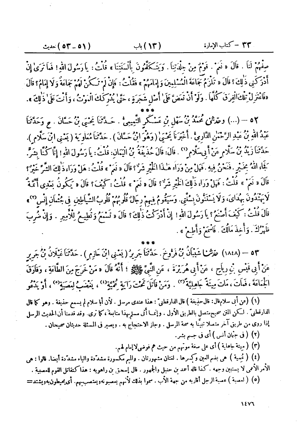 52 - (1847) وحَدَّثَنِي مُحَمَّدُ بْنُ سَهْلِ بْنِ عَسْكَرٍ التَّمِيمِيُّ، حَدَّثَنَا يَحْيَى بْنُ حَسَّانَ، ح وحَدَّثَنَا عَبْدُ اللهِ بْنُ عَبْدِ الرَّحْمَنِ الدَّارِمِيُّ، أَخْبَرَنَا يَحْيَى وَهُوَ ابْنُ حَسَّانَ، حَدَّثَنَا مُعَاوِيَةُ يَعْنِي ابْنَ سَلَّامٍ، حَدَّثَنَا زَيْدُ بْنُ سَلَّامٍ، عَنْ أَبِي سَلَّامٍ، قَالَ: قَالَ حُذَيْفَةُ بْنُ الْيَمَانِ: قُلْتُ: يَا رَسُولَ اللهِ، إِنَّا كُنَّا بِشَرٍّ، فَجَاءَ اللهُ بِخَيْرٍ، فَنَحْنُ فِيهِ، فَهَلْ مِنْ وَرَاءِ هَذَا الْخَيْرِ شَرٌّ؟ قَالَ: «نَعَمْ»، قُلْتُ: هَلْ وَرَاءَ ذَلِكَ الشَّرِّ خَيْرٌ؟ قَالَ: «نَعَمْ»، قُلْتُ: فَهَلْ وَرَاءَ ذَلِكَ الْخَيْرِ شَرٌّ؟ قَالَ: «نَعَمْ»، قُلْتُ: كَيْفَ؟ قَالَ: «§يَكُونُ بَعْدِي أَئِمَّةٌ لَا يَهْتَدُونَ بِهُدَايَ، وَلَا يَسْتَنُّونَ بِسُنَّتِي، وَسَيَقُومُ فِيهِمْ رِجَالٌ قُلُوبُهُمْ قُلُوبُ الشَّيَاطِينِ فِي جُثْمَانِ إِنْسٍ»، قَالَ: قُلْتُ: كَيْفَ أَصْنَعُ يَا رَسُولَ اللهِ، إِنْ أَدْرَكْتُ ذَلِكَ؟ قَالَ: «تَسْمَعُ وَتُطِيعُ لِلْأَمِيرِ، وَإِنْ ضُرِبَ ظَهْرُكَ، وَأُخِذَ مَالُكَ، فَاسْمَعْ وَأَطِعْ»