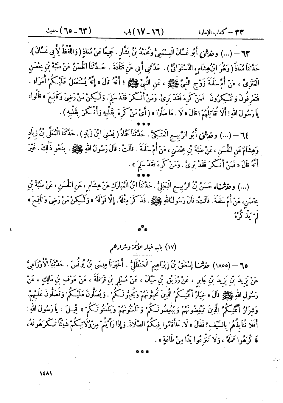 63 - (1854) وحَدَّثَنِي أَبُو غَسَّانَ الْمِسْمَعِيُّ، وَمُحَمَّدُ بْنُ بَشَّارٍ، جَمِيعًا عَنْ مُعَاذٍ، وَاللَّفْظُ لِأَبِي غَسَّانَ، حَدَّثَنَا مُعَاذٌ وَهُوَ ابْنُ هِشَامٍ الدَّسْتَوَائِيُّ، حَدَّثَنِي أَبِي، عَنْ قَتَادَةَ، حَدَّثَنَا الْحَسَنُ، عَنْ ضَبَّةَ بْنِ مِحْصَنٍ الْعَنَزِيِّ، عَنْ أُمِّ سَلَمَةَ، زَوْجِ النَّبِيِّ صَلَّى اللهُ عَلَيْهِ وَسَلَّمَ، عَنِ النَّبِيِّ صَلَّى اللهُ عَلَيْهِ وَسَلَّمَ أَنَّهُ قَالَ: «إِنَّهُ §يُسْتَعْمَلُ عَلَيْكُمْ أُمَرَاءُ، فَتَعْرِفُونَ وَتُنْكِرُونَ، فَمَنْ كَرِهَ فَقَدْ بَرِئَ، وَمَنْ أَنْكَرَ فَقَدْ سَلِمَ، وَلَكِنْ مَنْ رَضِيَ وَتَابَعَ»، قَالُوا: يَا رَسُولَ اللهِ، أَلَا نُقَاتِلُهُمْ؟ قَالَ: «لَا، مَا صَلَّوْا»، أَيْ مَنْ كَرِهَ بِقَلْبِهِ وَأَنْكَرَ بِقَلْبِهِ،