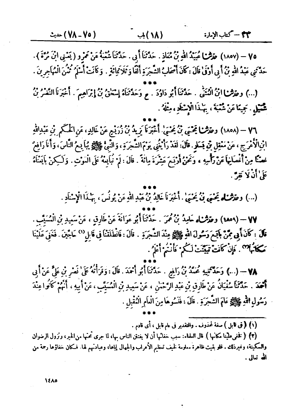 76 - (1858) وحَدَّثَنَا يَحْيَى بْنُ يَحْيَى، أَخْبَرَنَا يَزِيدُ بْنُ زُرَيْعٍ، عَنْ خَالِدٍ، عَنِ الْحَكَمِ بْنِ عَبْدِ اللهِ بْنِ الْأَعْرَجِ، عَنْ مَعْقِلِ بْنِ يَسَارٍ، قَالَ: لَقَدْ رَأَيْتُنِي يَوْمَ الشَّجَرَةِ، وَالنَّبِيُّ صَلَّى اللهُ عَلَيْهِ وَسَلَّمَ يُبَايِعُ النَّاسَ، وَأَنَا رَافِعٌ غُصْنًا مِنْ أَغْصَانِهَا عَنْ رَأْسِهِ، وَنَحْنُ أَرْبَعَ عَشْرَةَ مِائَةً، قَالَ: «§لَمْ نُبَايِعْهُ عَلَى الْمَوْتِ، وَلَكِنْ بَايَعْنَاهُ عَلَى أَنْ لَا نَفِرَّ»،